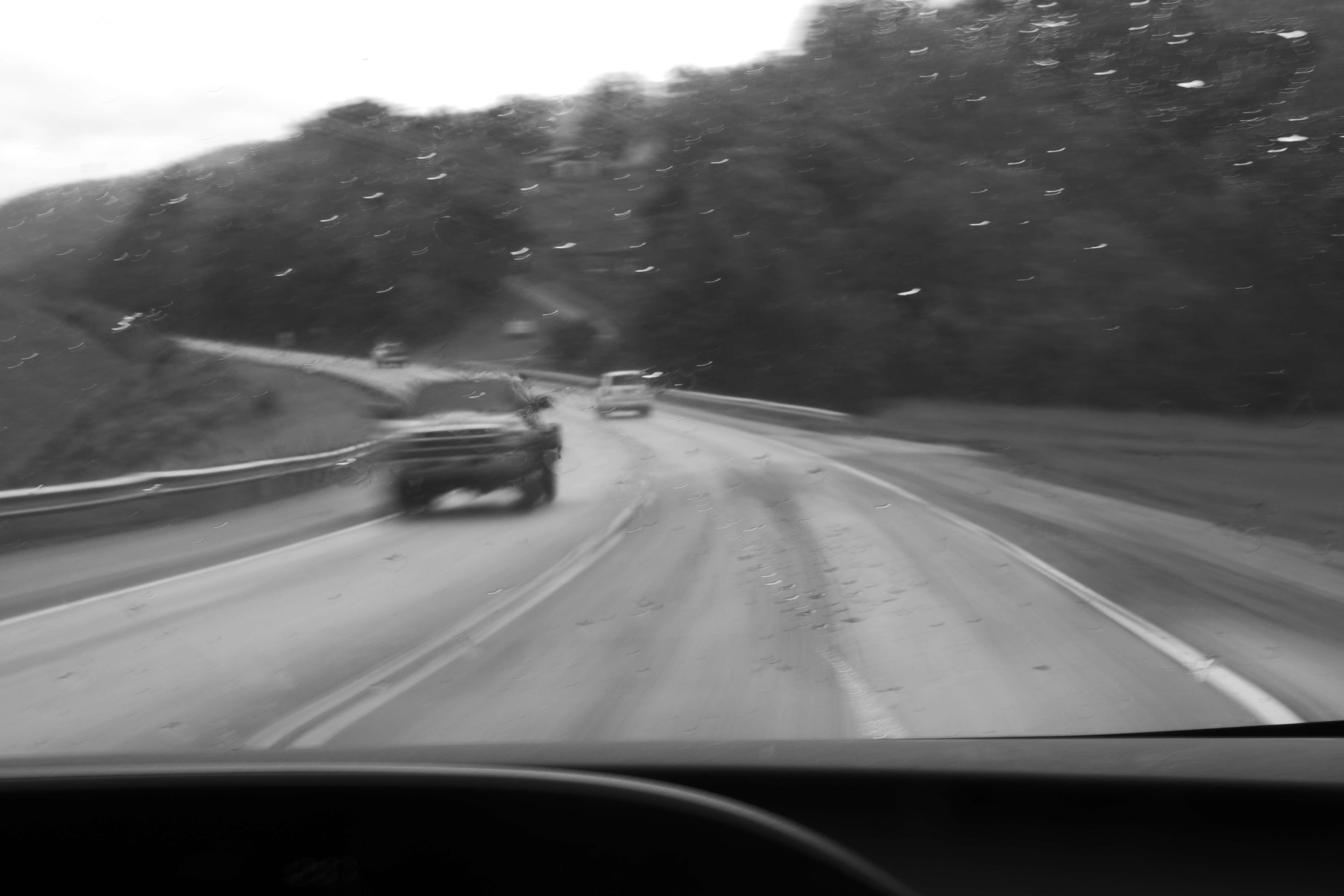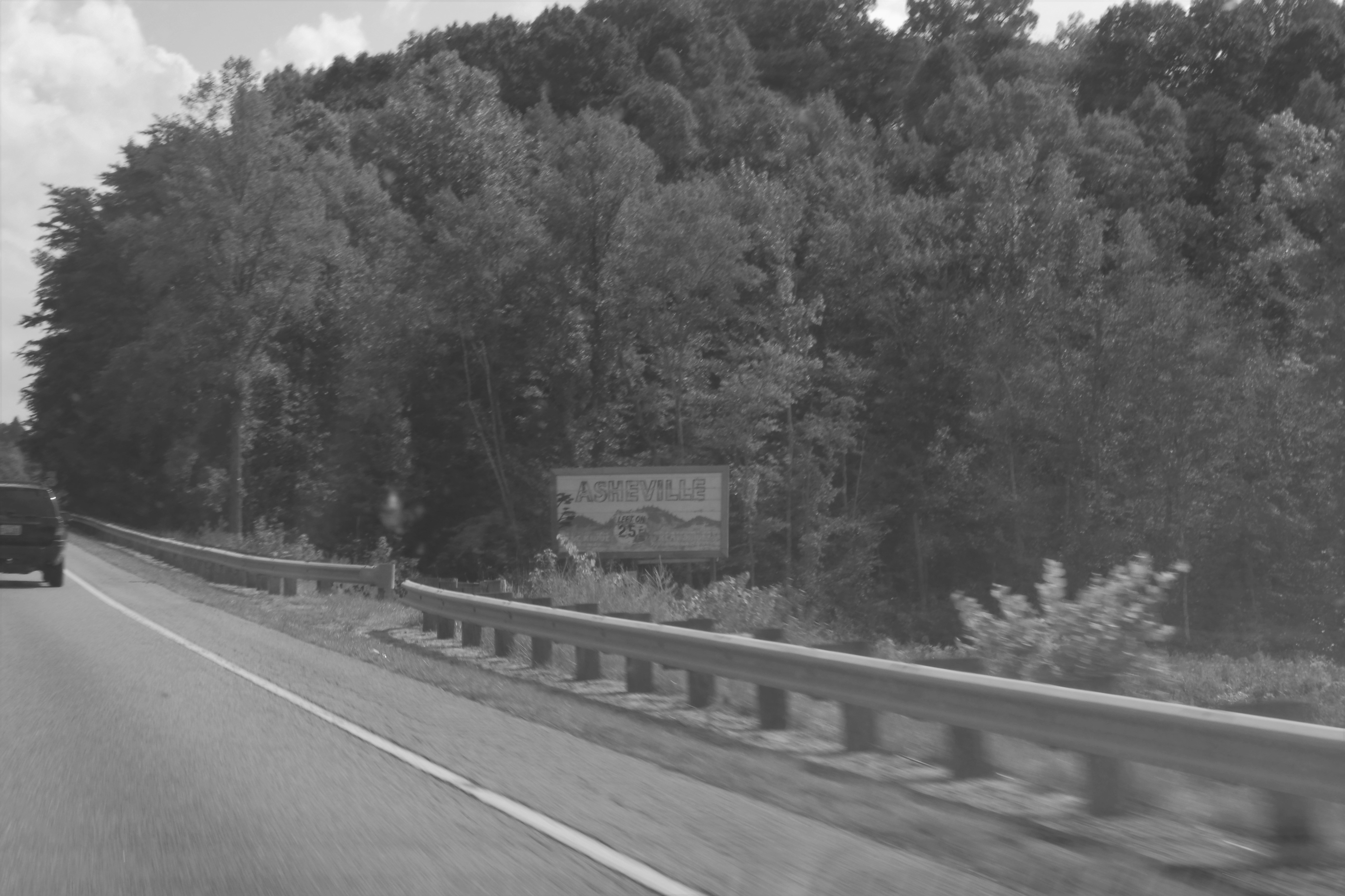 one of the big things i was interested in playing with this week was long-exposure photography. if black and white photos are going to look "old," is there a way that i can push that perception to its breaking point? does a time-warped "old" photo look different? here's one experiment, taken from the passenger seat of a moving vehicle (safety first!)