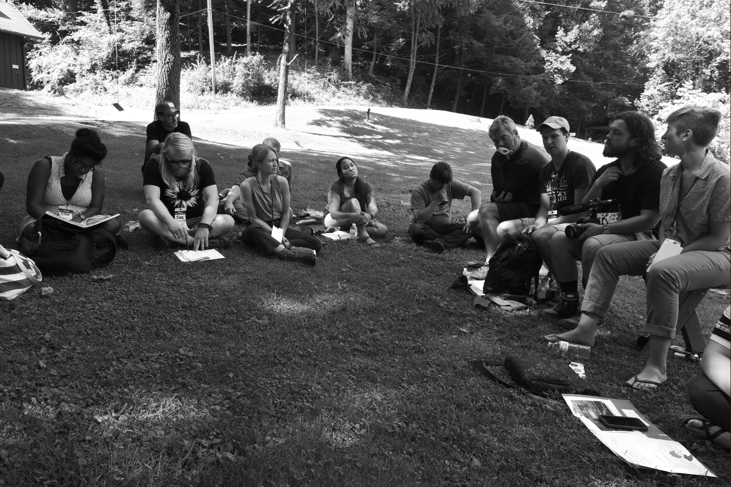 members of the 2018 Kentucky Rural-Urban Exchange cohort discuss their relationships to place on the grounds of Hindman Settlement School