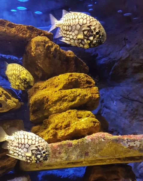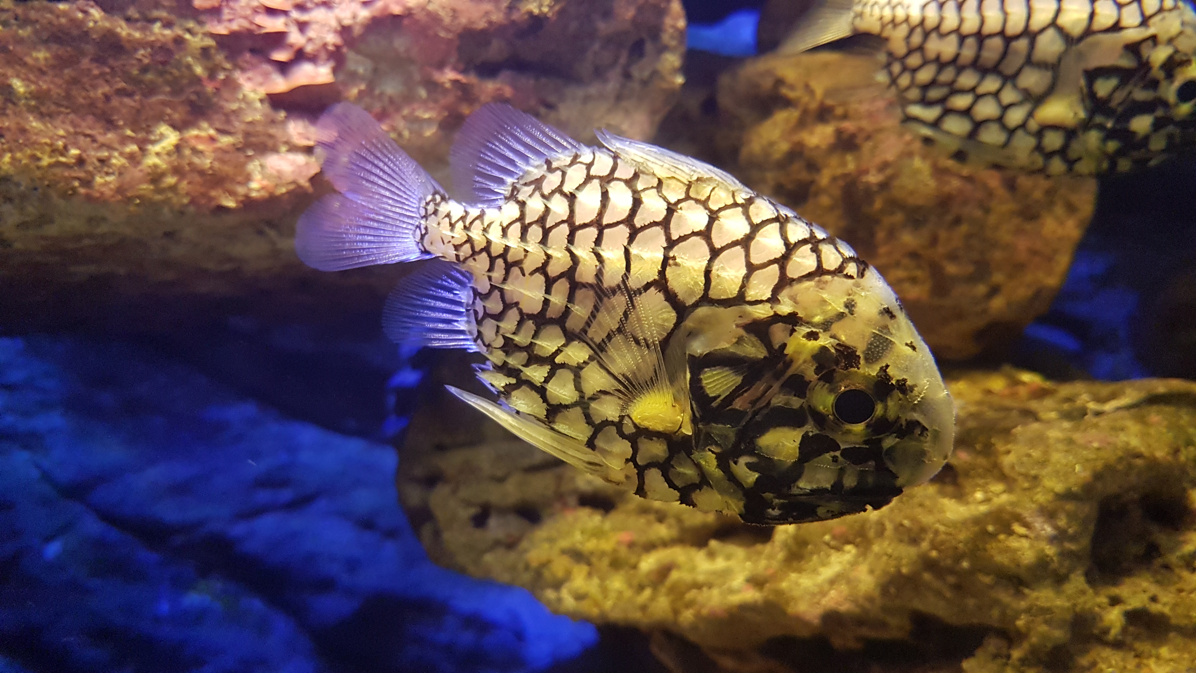 This pretty unique yellow and black scaled fish is a member of the family Monocentridae. It is a hardy and long-lived aquarium specimen. It is fully armoured with spines; the yellow scales are bony plates and the backward rays on the fins have sharp spikes. The Latin name for the pineapple fish means, glory of the sea.