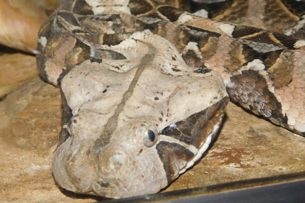 The Gaboon Adder is primarily nocturnal, they are quite placid and moves very slowly. They can reach a length of about 80-170cm and weighs anything between 8-11kg as adults. Gestation takes 7 months and the female give live birth to 8-40 young during late summer.