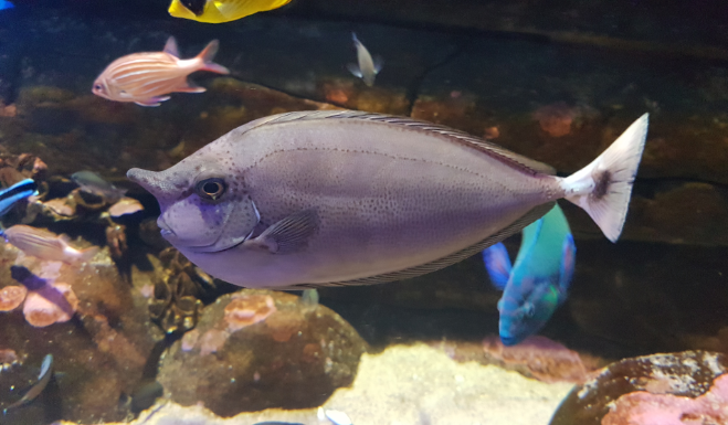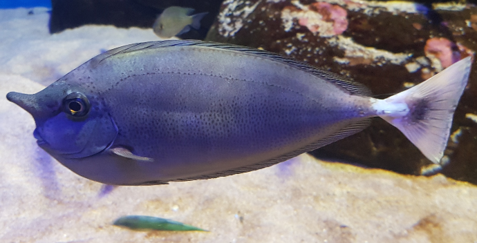 The spotted unicorn fish are blue-gray to olive-brown in colour and can reach a length of 60cm, the colour change with its moods mostly when feeling threatened or during mating. The tail fins are blue to white, they have small mouths with blue lips, and 2 plates (sharp scalpels) that looks like hooks on its tail which is used for defence. Some species are venomous and can cause painful wounds.