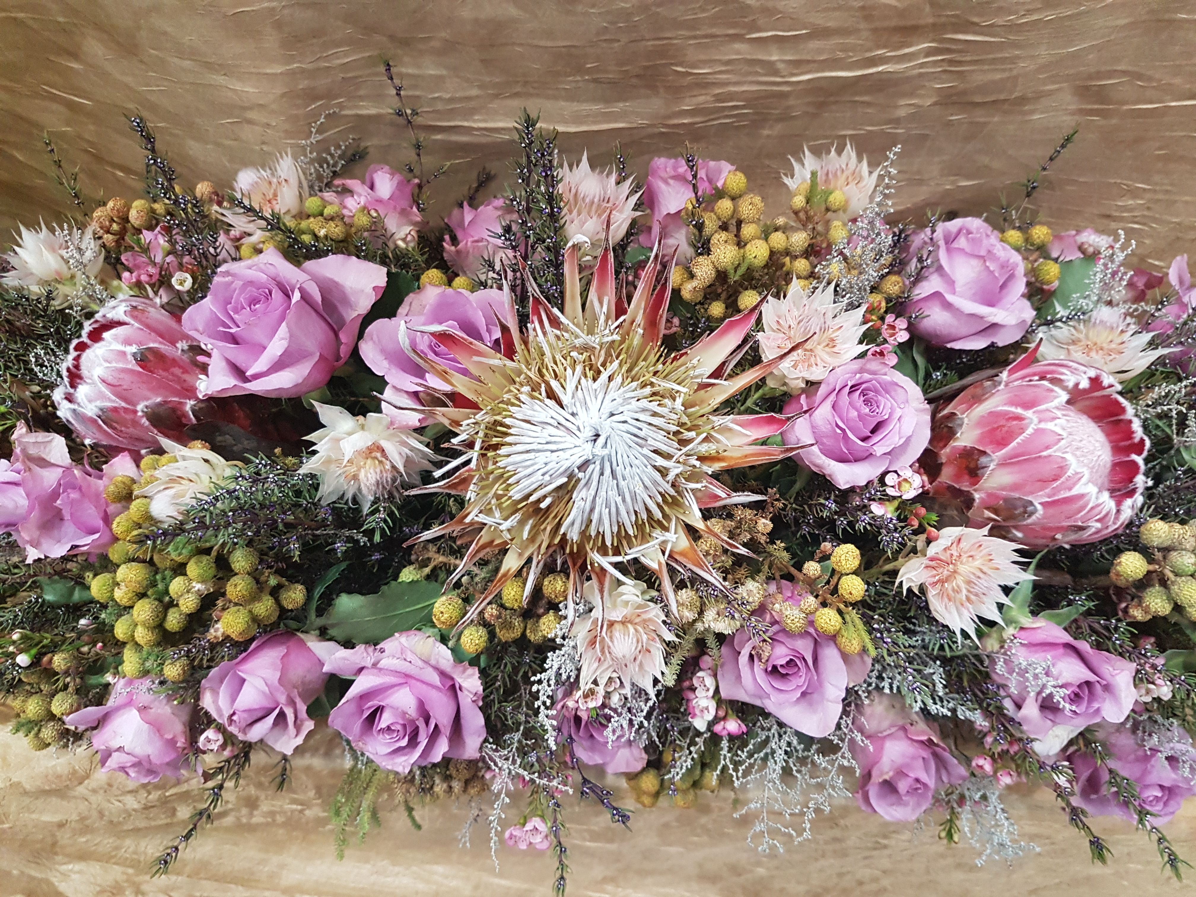 I adore flower arrangements with a mixture of proteas and roses. The first and last photo is an example of this combination.