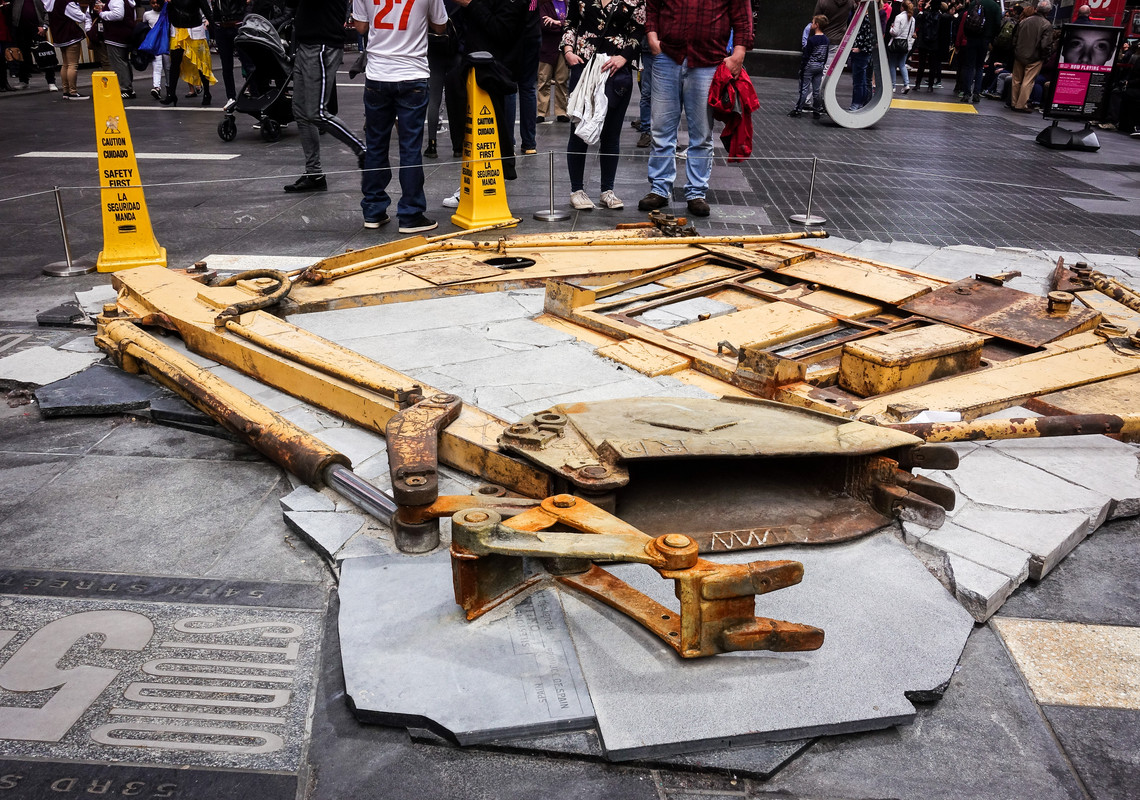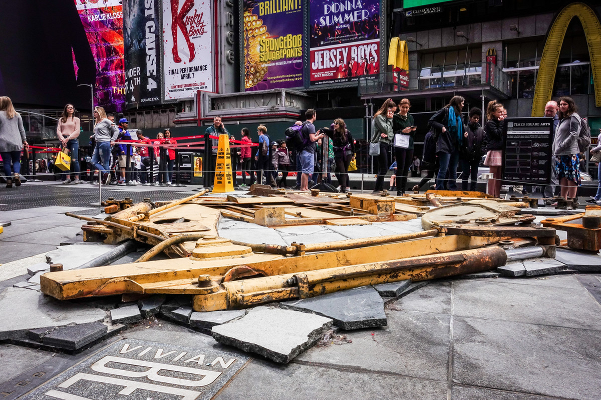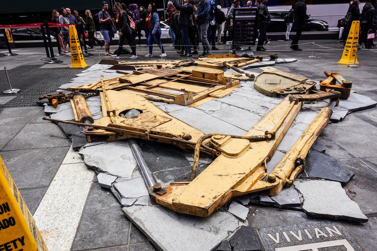 In partnership with times square arts and SPRING/BREAK art show, artist michael zelehoski and curator ché morales, present ‘the rapture’ – a monumental sculpture situated in new york’s times square. the duo have salvaged a construction backhoe, then deconstructed and reassembled it in the busy broadway plaza to appear as the image of a fossilized dinosaur. on view until march 31st, 2019, the project intends to question humanity’s significance on earth by using an item of technology used to build our civilization and making it appear ‘extinct.’