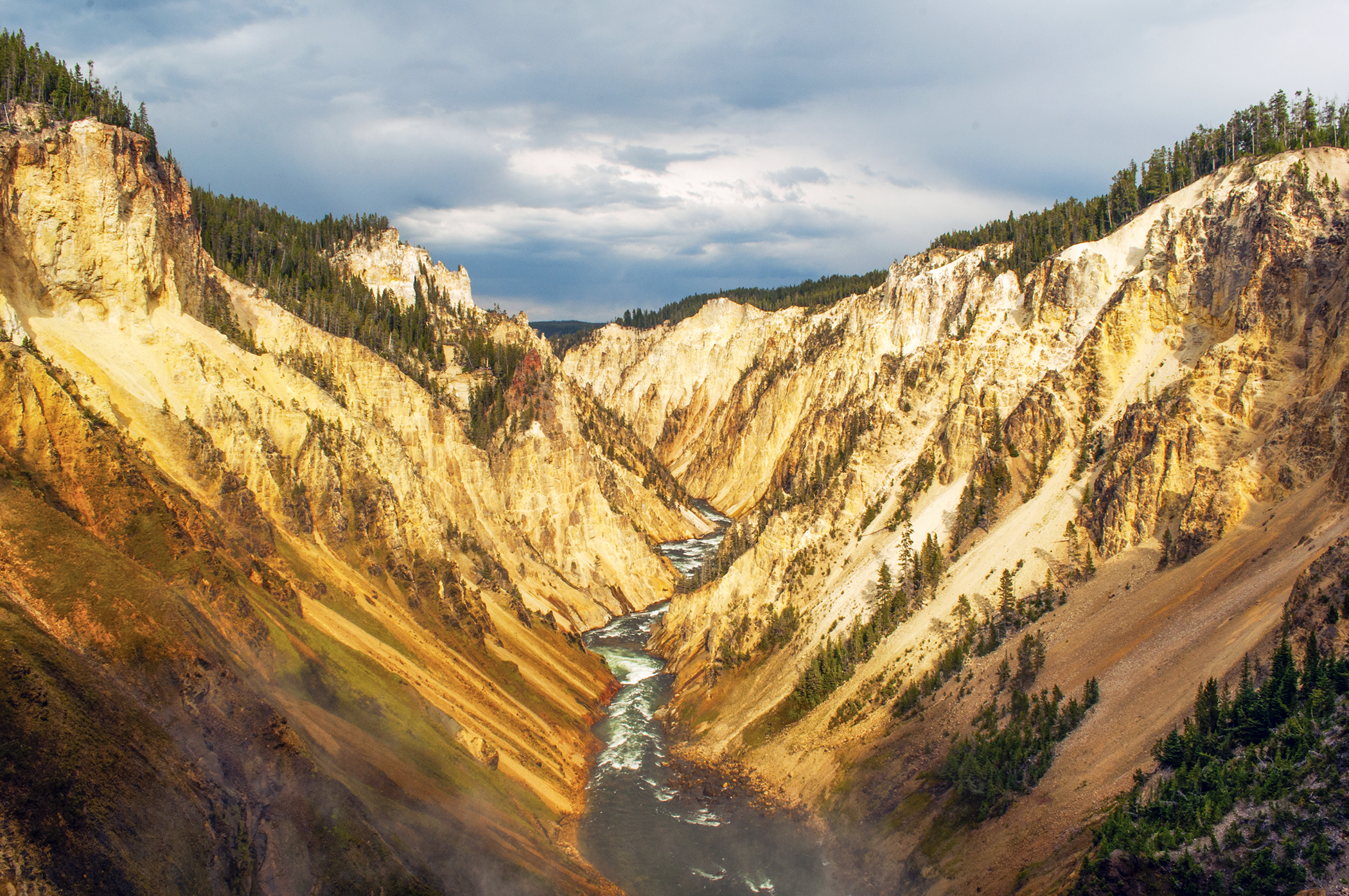 Much of Yellowstone National Park lies within the caldera formed 630,000 years ago when the supervolcano beneath the park last had a major eruption. The Grand Canyon of Yellowstone is within that caldera and you can definitely tell that the volcanic activity is still going on beneath the surface. The air in the canyon is fragrant with the aroma of sulfur, steam randomly rises from the ground in various places (the mist in the foreground is from the waterfall rather than steam due to volcanic activity), and the rock and soil are discolored from fluids that have percolated up to the surface over millennia (they've actually chemically altered the rock/soil over time) .