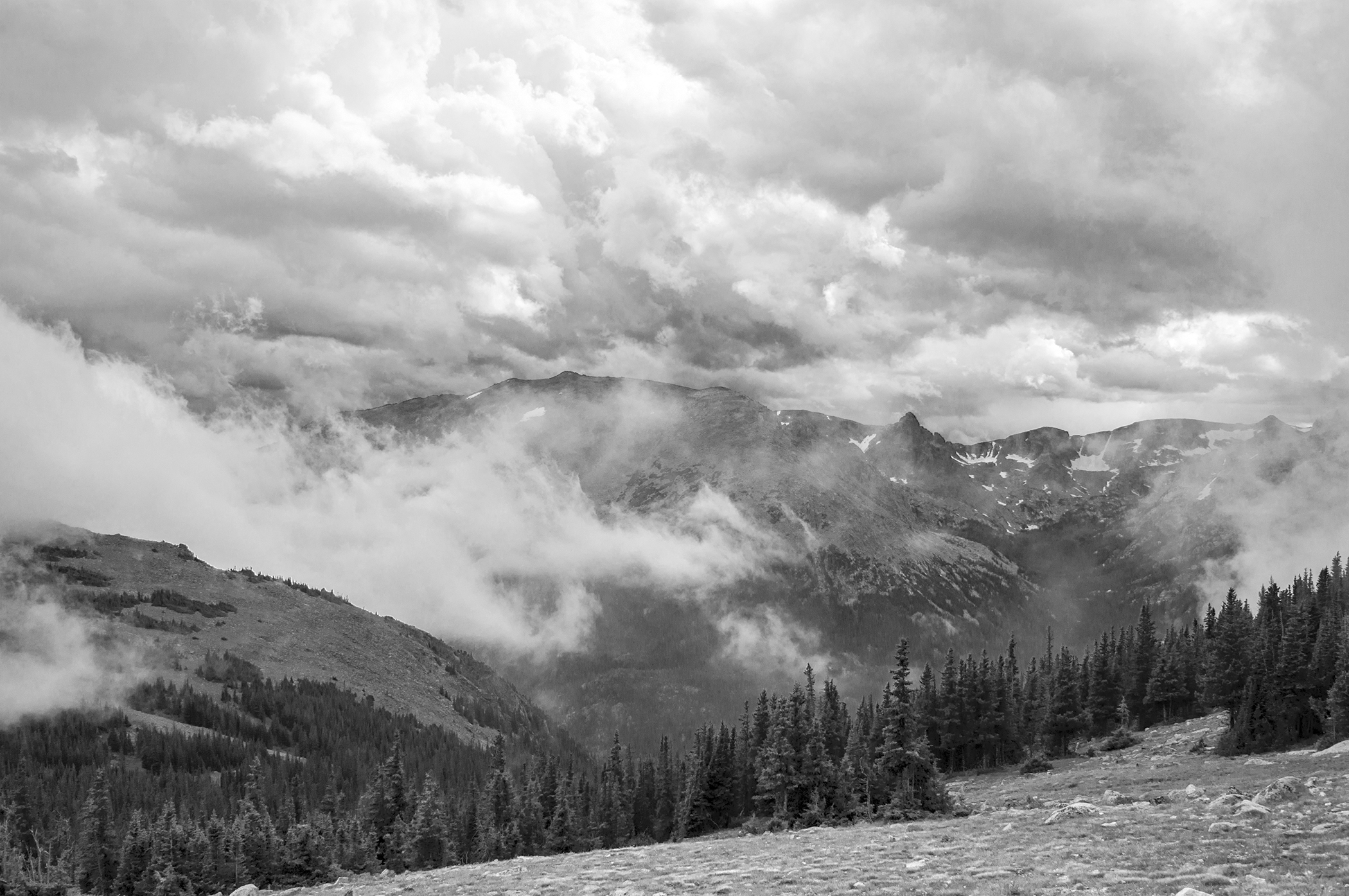 Shot from Rocky Mountain National Park, moments before the clouds rolled in and obscured everything. One minute they're hanging out over the next line of mountains and then next thing you know, you're in the clouds and visibility is down to 5-10 feet.