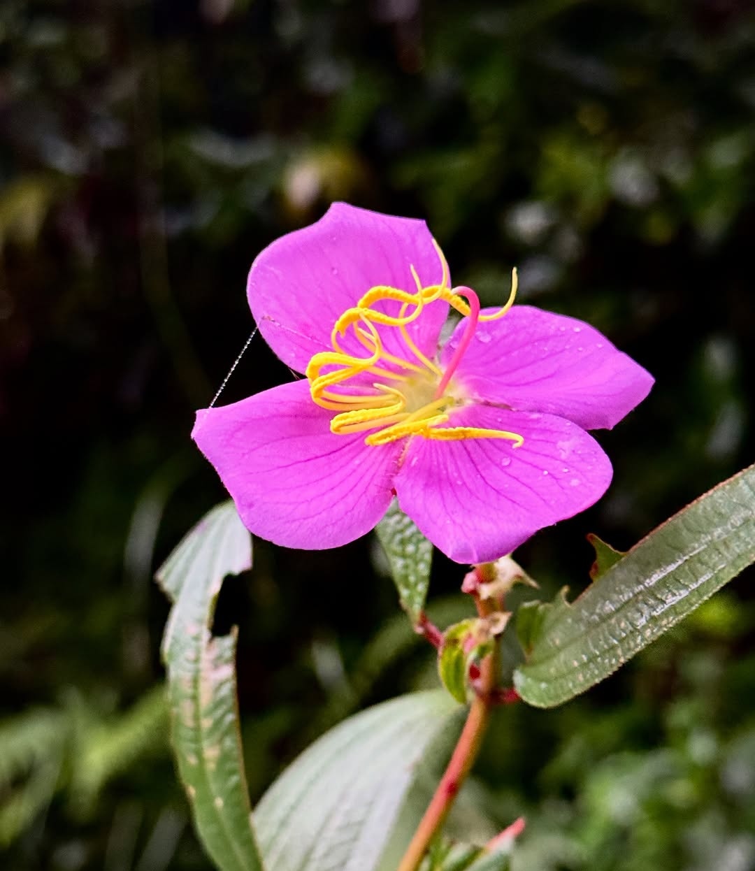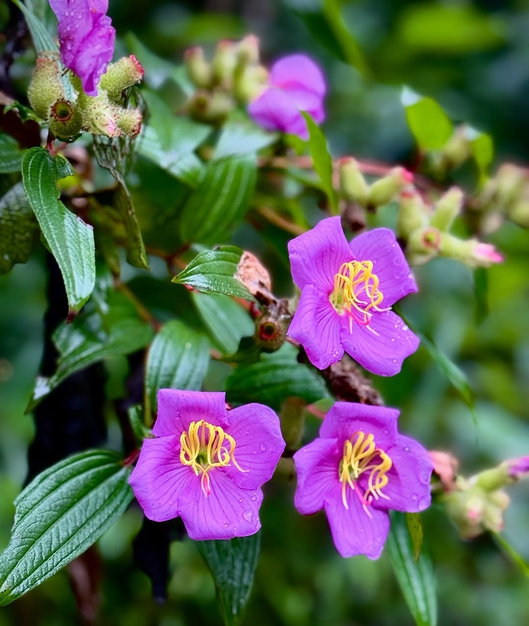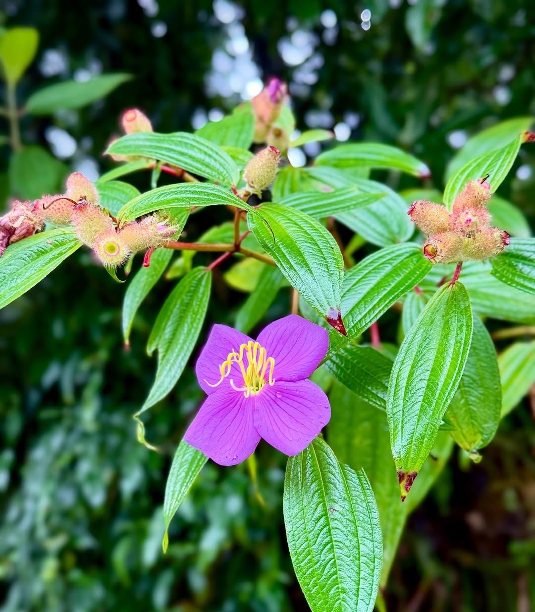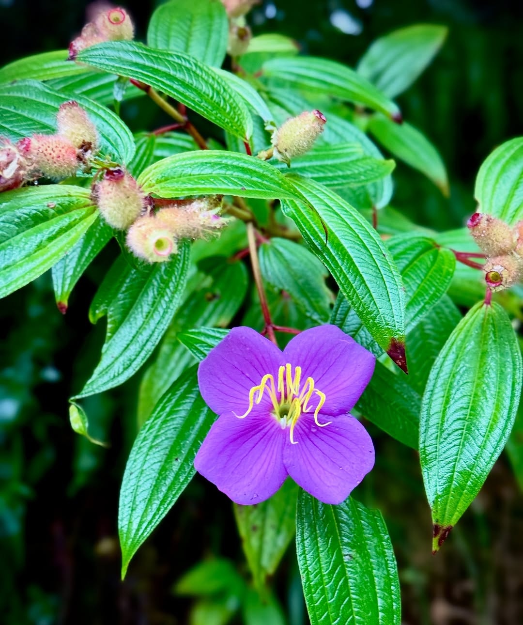 Leaves: The leaves are simple, opposite, and covered with fine hairs. They are usually lance-shaped with three prominent longitudinal veins—a characteristic feature of Melastomataceae.