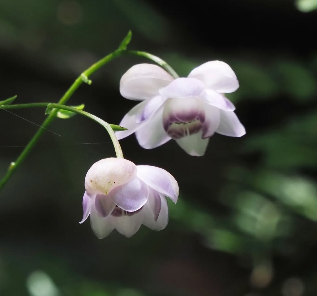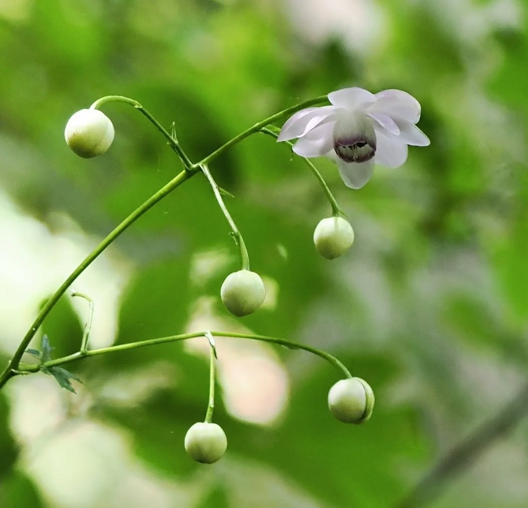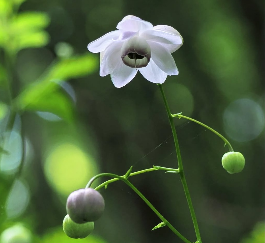 Flowers: The true allure of Anemonopsis lies in its pendulous, nodding blossoms. The flowers, borne on slender wiry stems, are typically pale lavender to mauve, with a darker purple center and a waxy, porcelain-like sheen. Each bloom resembles a small anemone or a fairy lantern, giving the plant an ethereal quality.