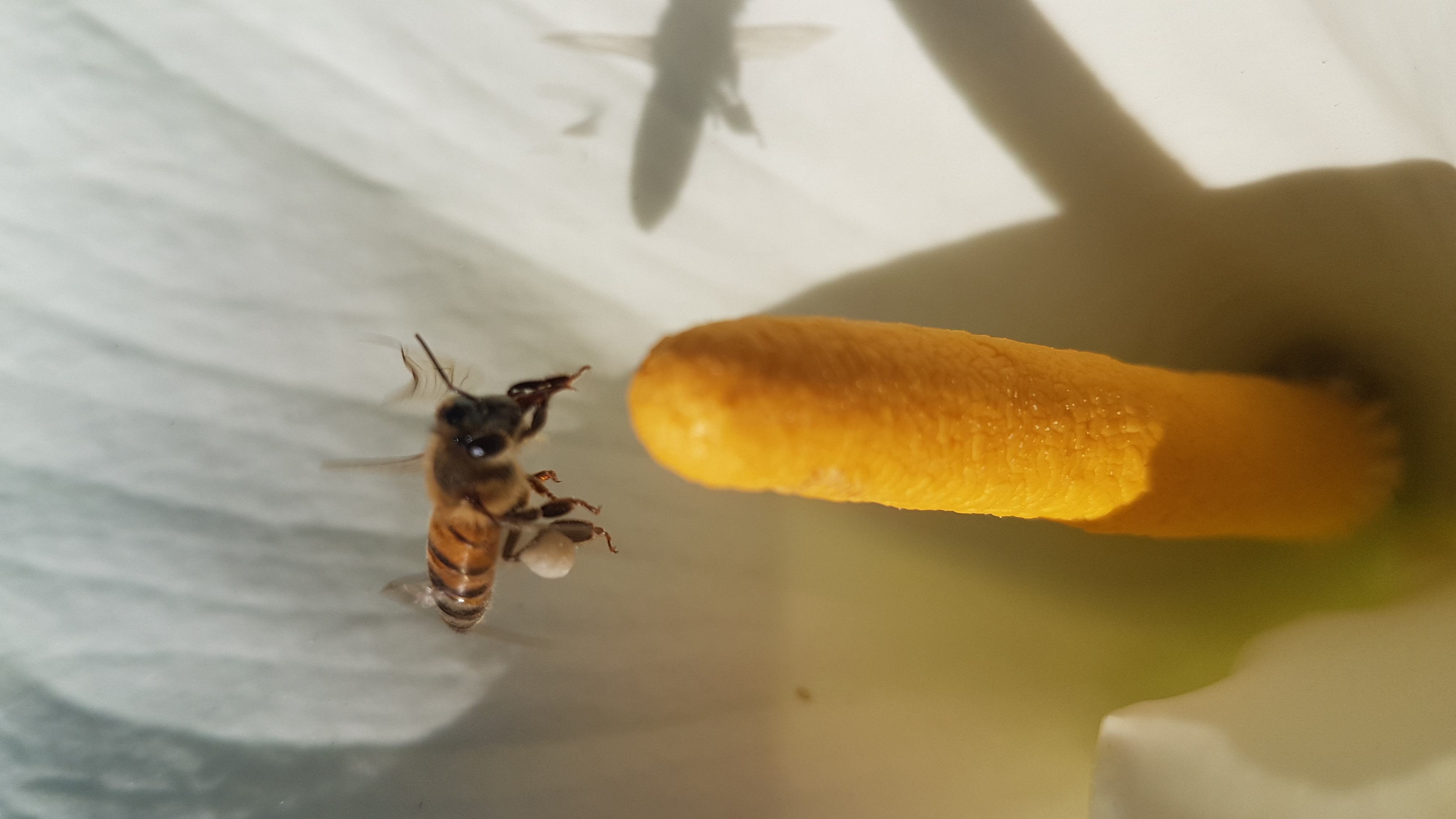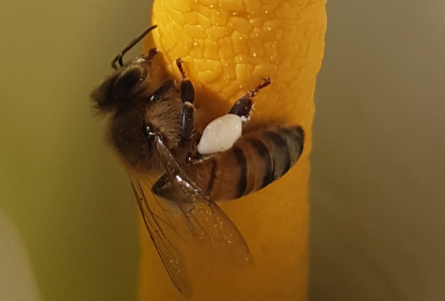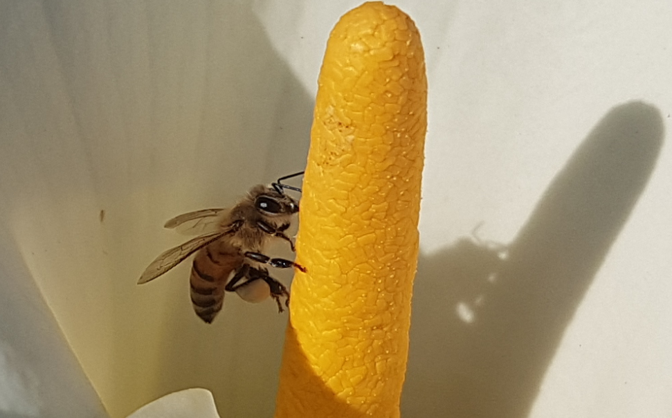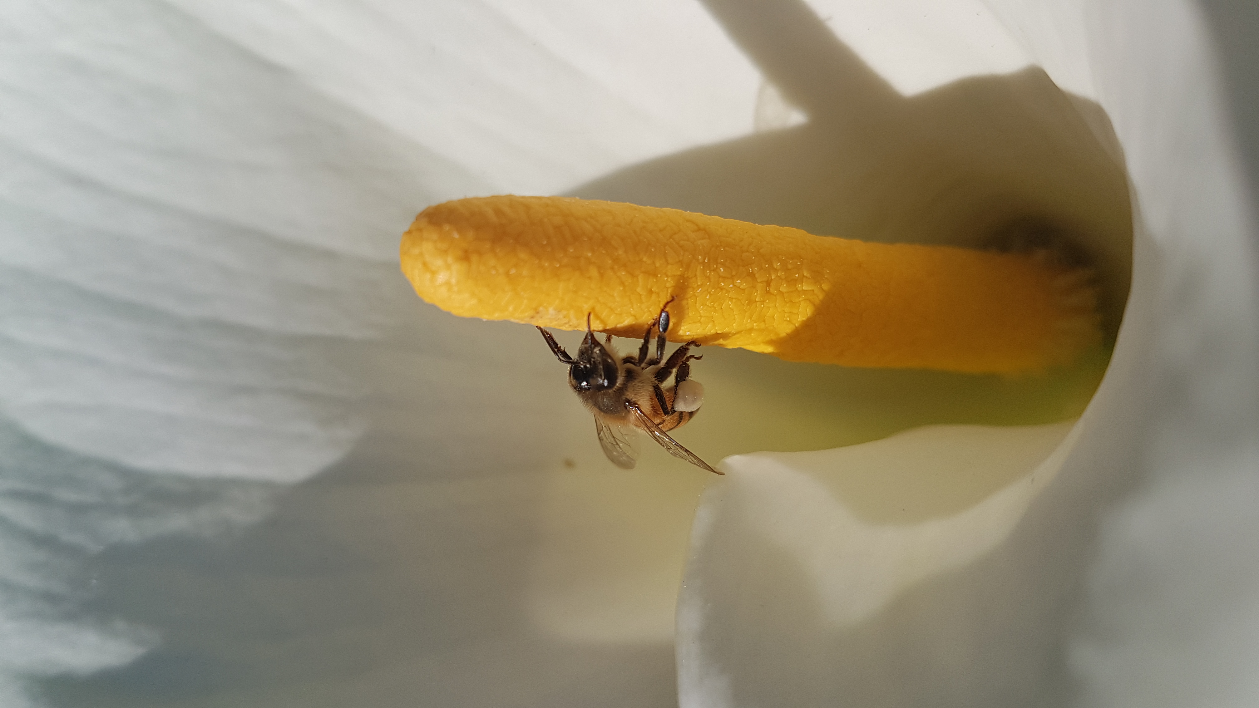 While taking some photographs of an Arum Lilly, I spotted this little female working bee hard at work collecting pollen in her pollen basket (corbicula). Watching her going about from flower to flower, I was reminded of a poem I read by James Jarrett while doing research for an English project last year which I thought I will share with you.