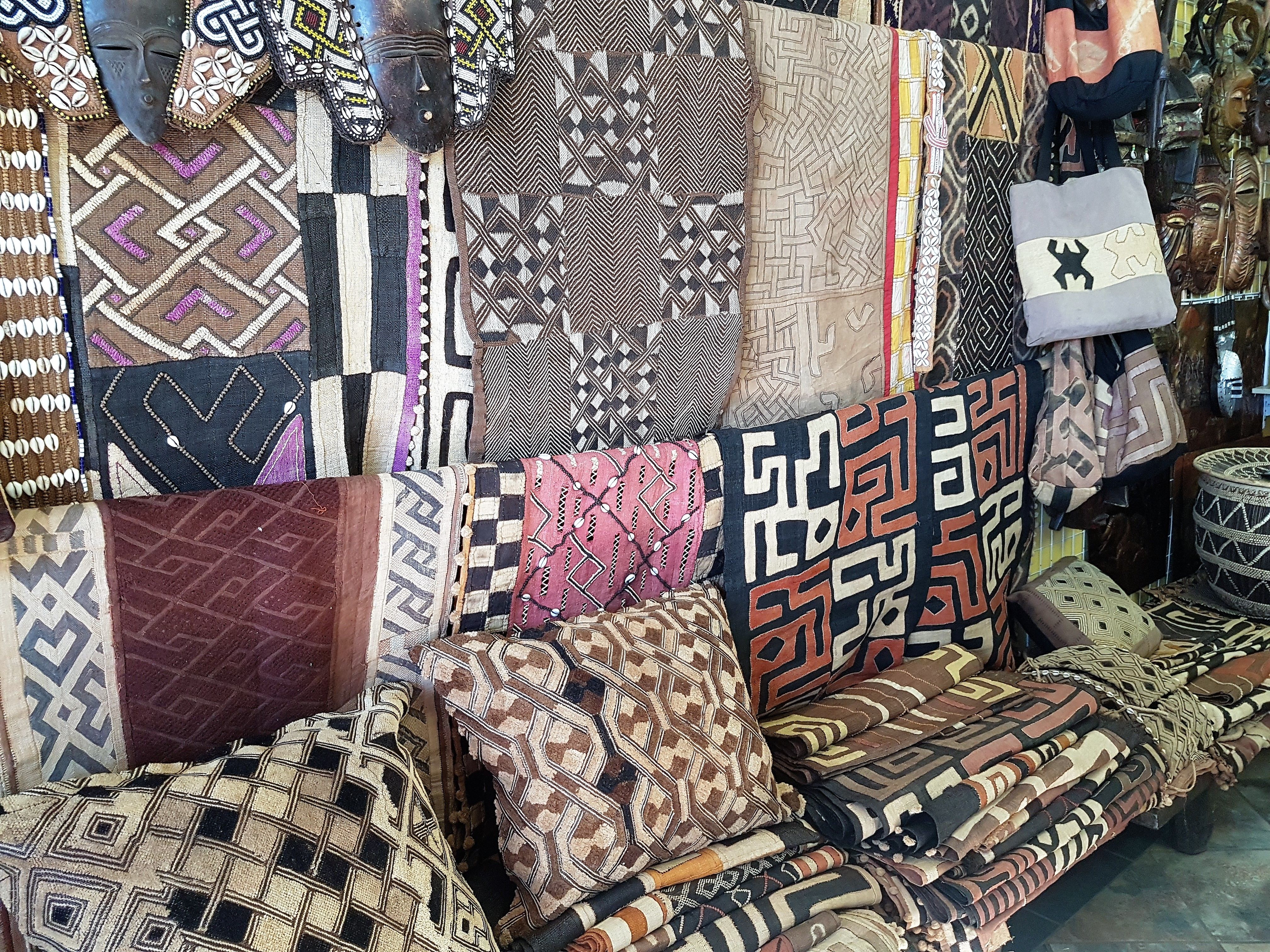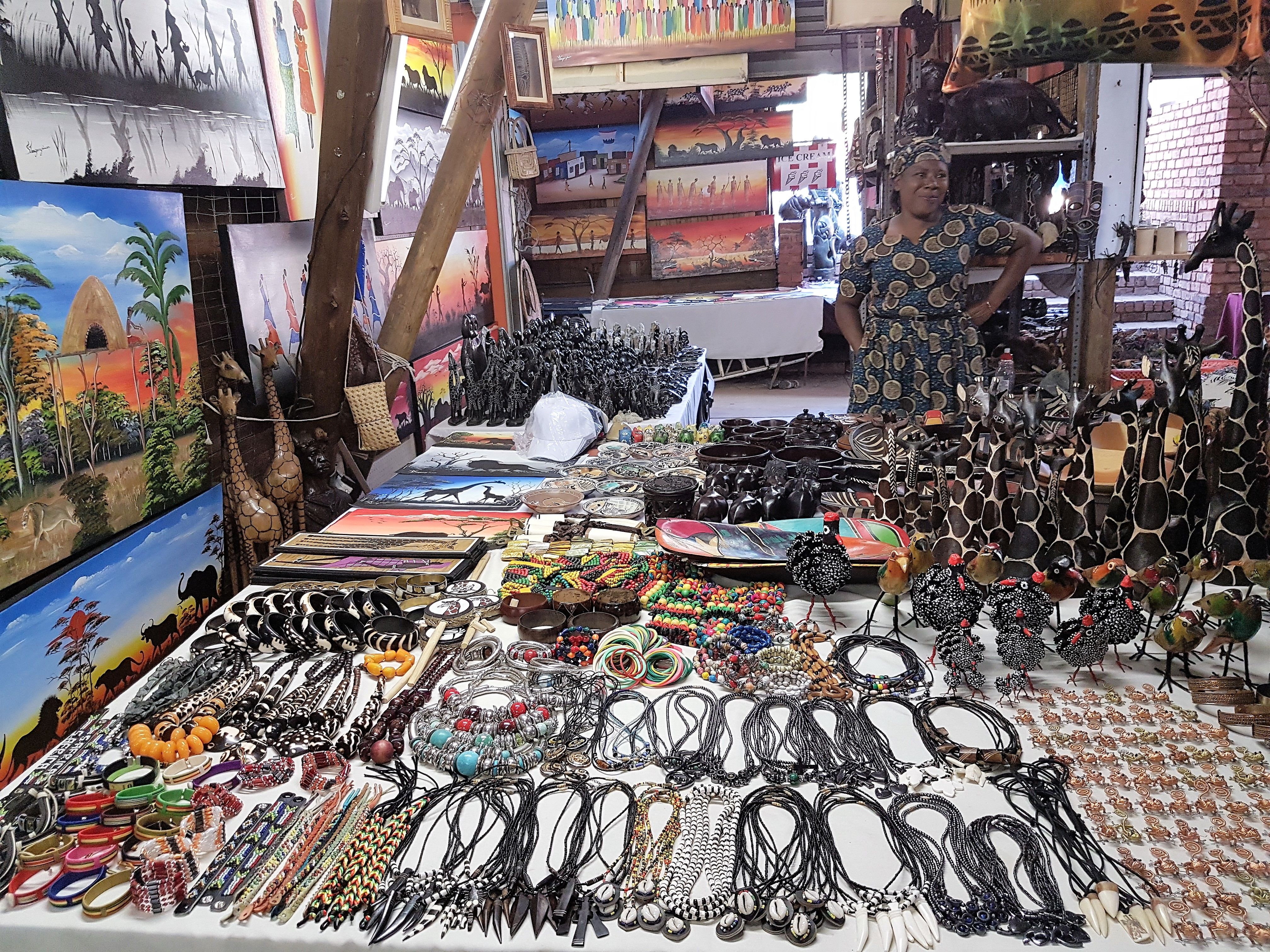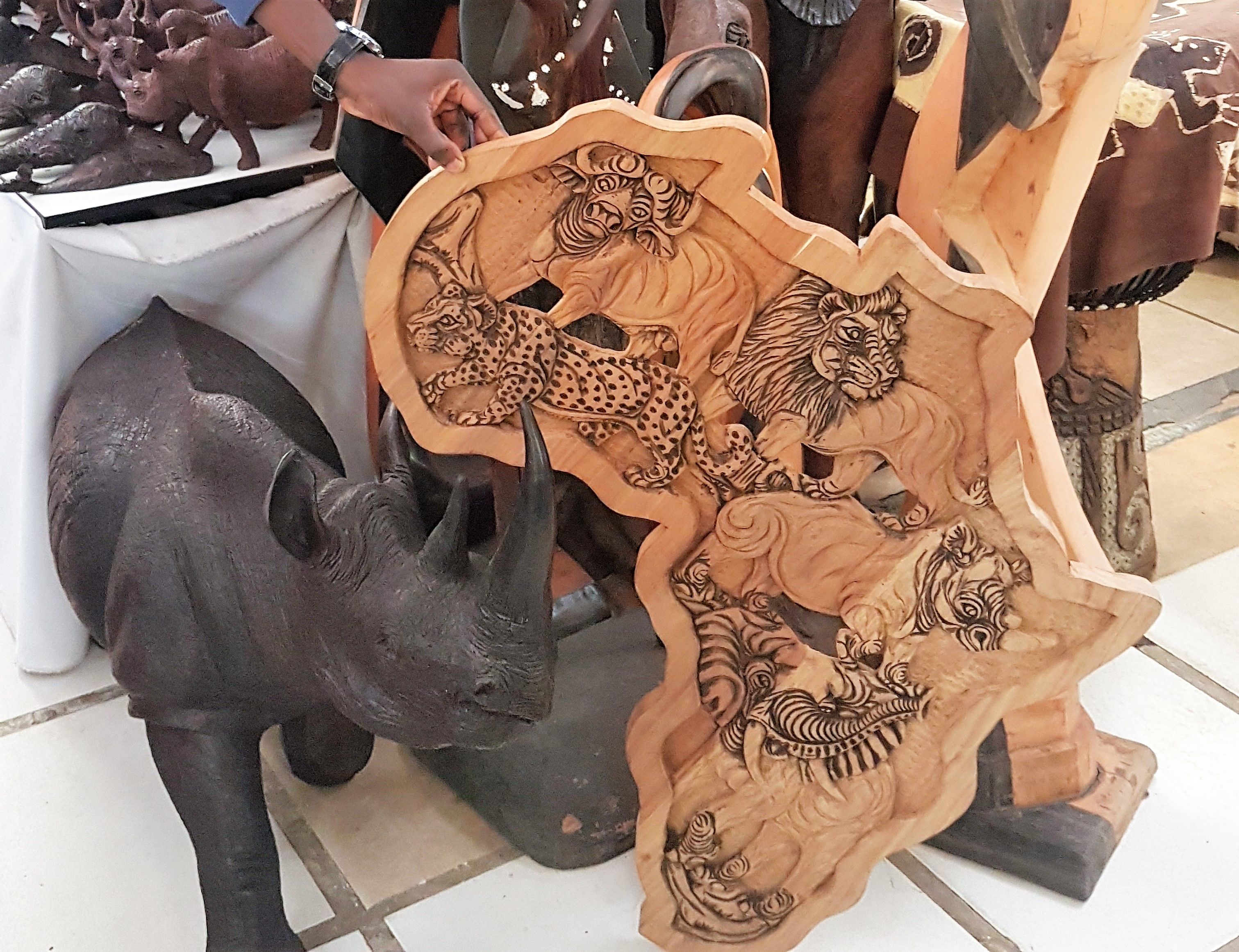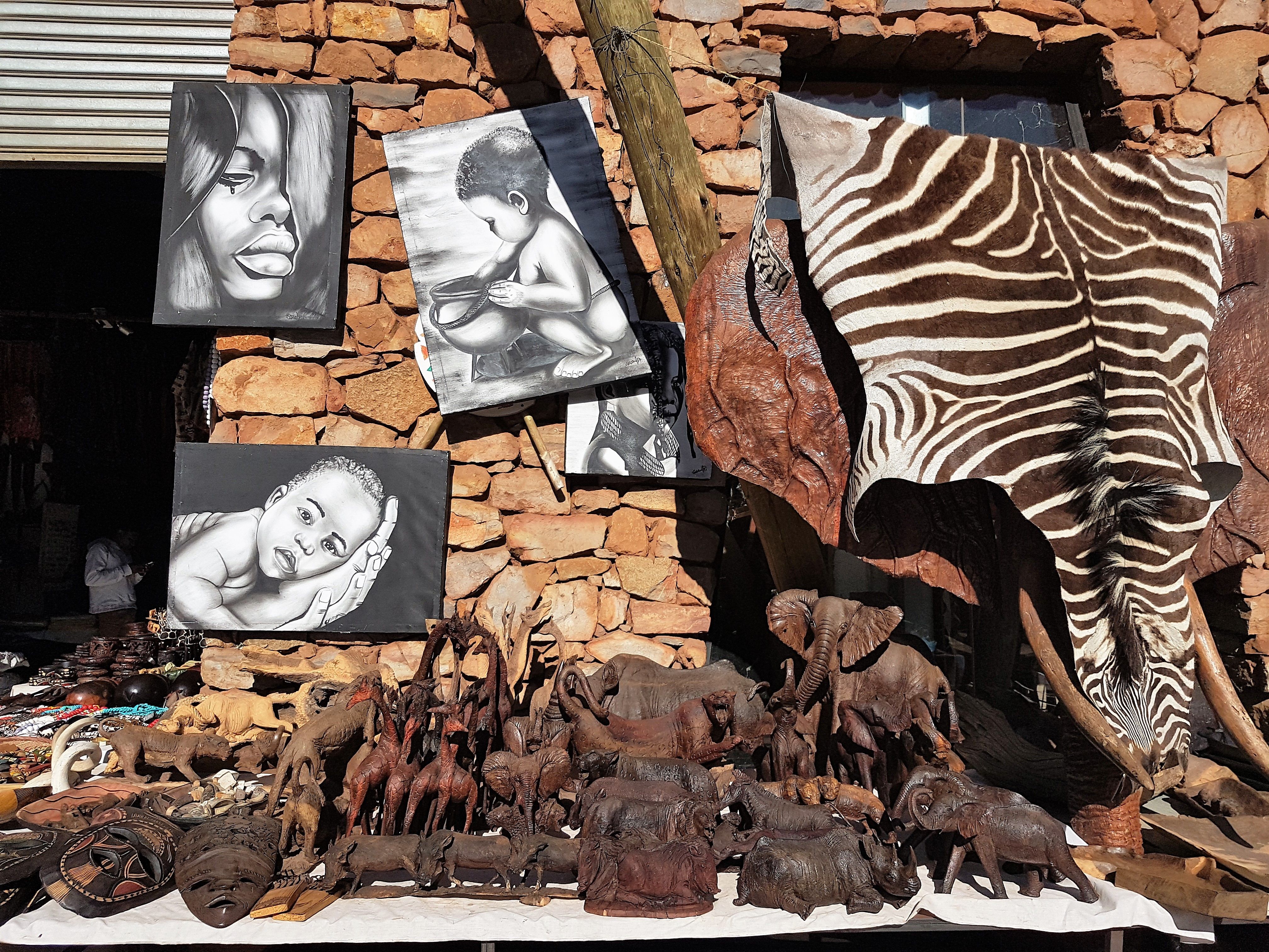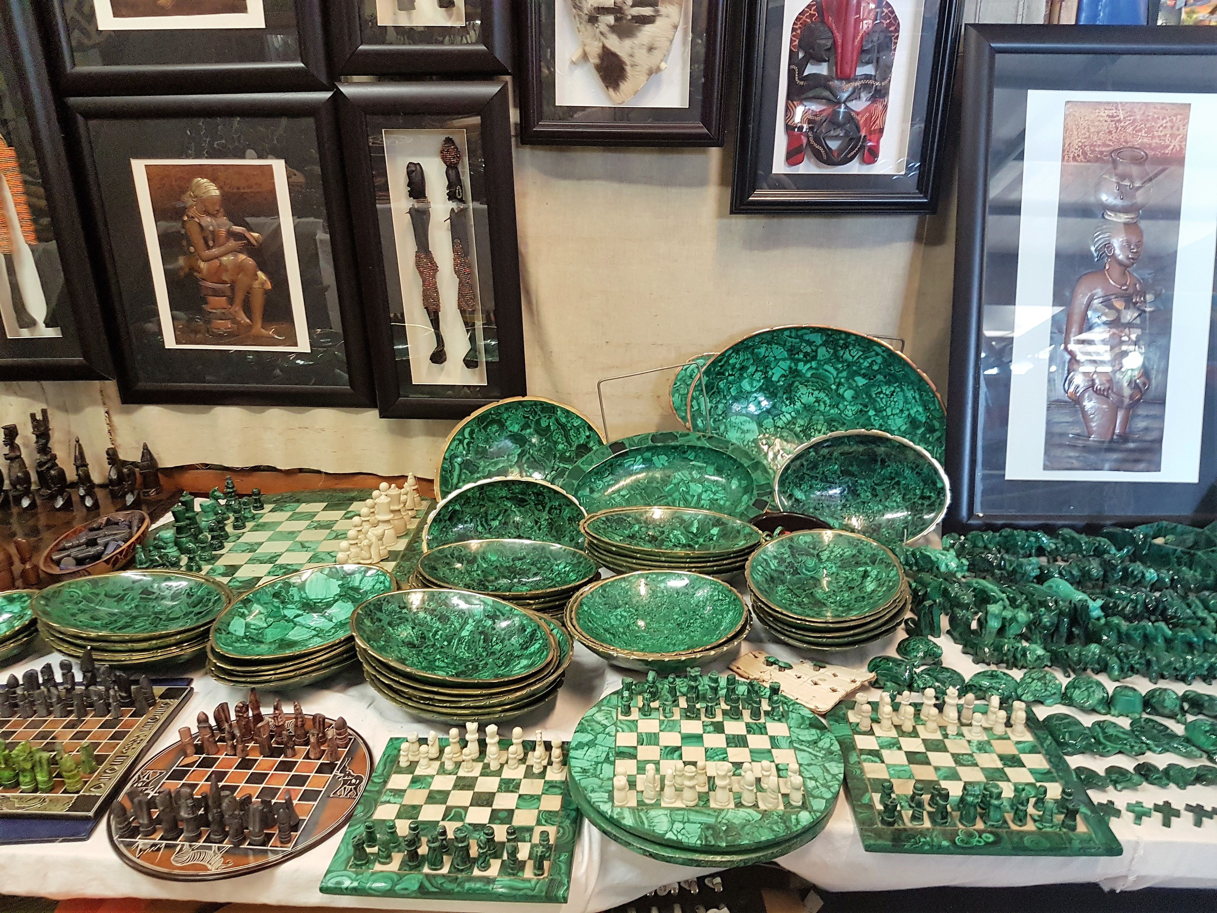 There are also shops selling all kinds of African wooden and limestone sculptures of animals, chiefs, carved pieces of the African continent with animals on it and masks.