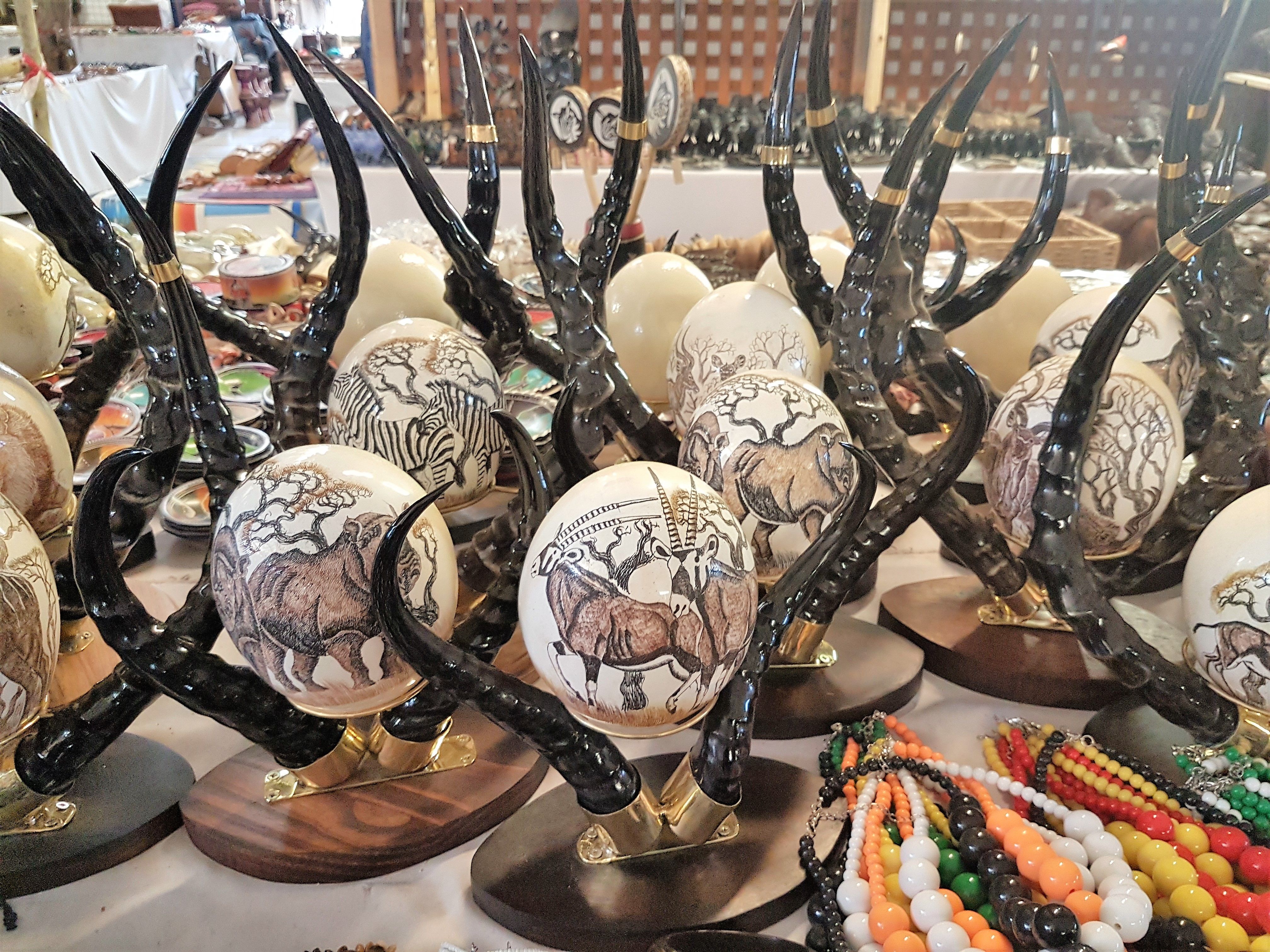 One off my all-time favourite, the wide variety of painted and carved ostrich eggs. You can buy them with or without these horned stands.