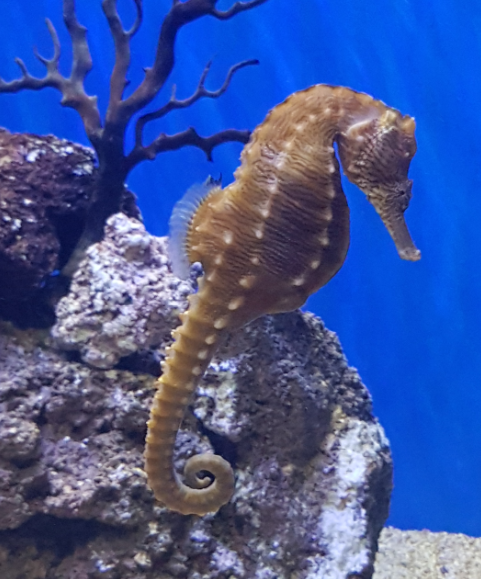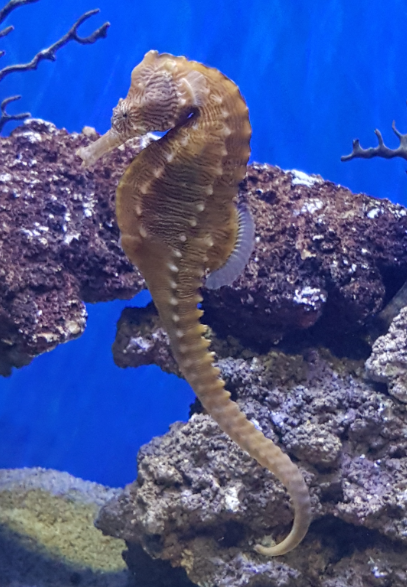The Seahorse is monogamous and mate with a partner for a season or for lifetime. After a courting dance by the couple, the female deposits her eggs (200-600) into the male’s brood pouch under his tail, he seals and fertilizes the eggs, and curries the embryos to term (20 days).