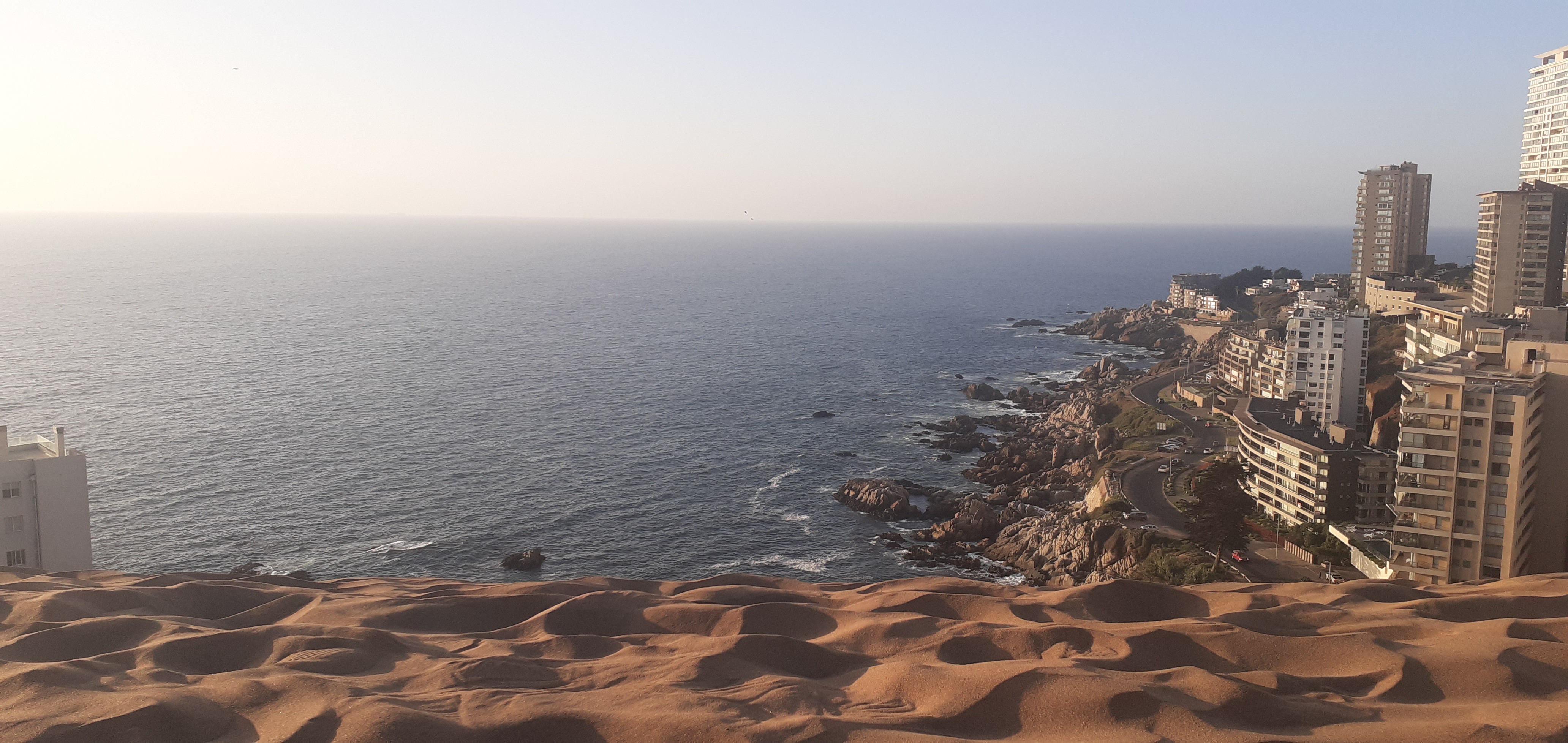 A un par de horas de la capital chilena, bordeando la costa del Pacífico, después de pasar por Valparaíso y Viña del Mar, encontramos Concón. Se trata de una ciudad pequeña cuya atracción principal son sus dunas, unas montañas de arena al borde del océano. La tarde de un sábado, hace tres meses, subí allí a observar el atardecer y pude capturar esta imagen. Desde la arena, se ve el horizonte infinito del agua y a un extremo los edificios, la carretera y los autos. En una sola fotografía muestro los aspectos principales de Concón: la costa, el Pacífico, la ciudad y las dunas. Hasta hoy, ha sido una de mis experiencias y fotografías favoritas.