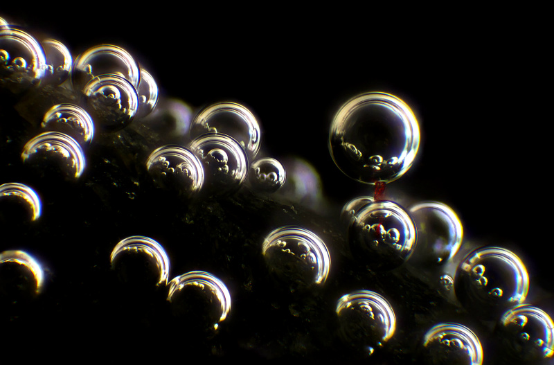 Bubbles and single cloth fibre (red) on a rock surface (10x magnification)