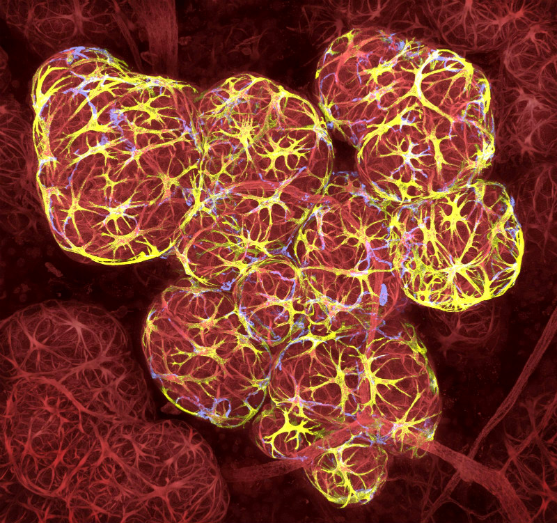 (Milky Way) Breast tissue in lactation: Milk filled spheres (red) surrounded by tiny muscle cells that squeeze out milk (yellow) and immune cells that monitor for infection (blue) (63 x magnification) 17th place