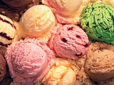 ice cream, frozen dairy food made from cream or butterfat, milk, sugar, and flavourings. Frozen custard and French-type ice creams also contain eggs. Hundreds of flavours have been devised, the most popular being vanilla, chocolate, and strawberry.