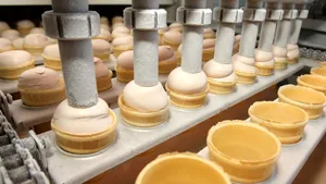 Commercial ice cream is made by combining, under constant agitation, the liquid ingredients (milk, cream, syrups, etc.). These liquids are heated and combined with dry ingredients (sugar, stabilizers, dried eggs or milk) to form a mix, which is then pasteurized and homogenized. The mix is ripened for several hours in a refrigerated vat, then combined with finely chopped fruit, nuts, or other solids. The mix is agitated while being frozen in order to incorporate air and control the size of the ice crystals that are formed. The partially frozen ice cream is drawn off into packages and frozen solid, or “hardened.” So-called soft-service ice cream was invented in 1939; it is served directly from the freezing machine without being allowed to harden.