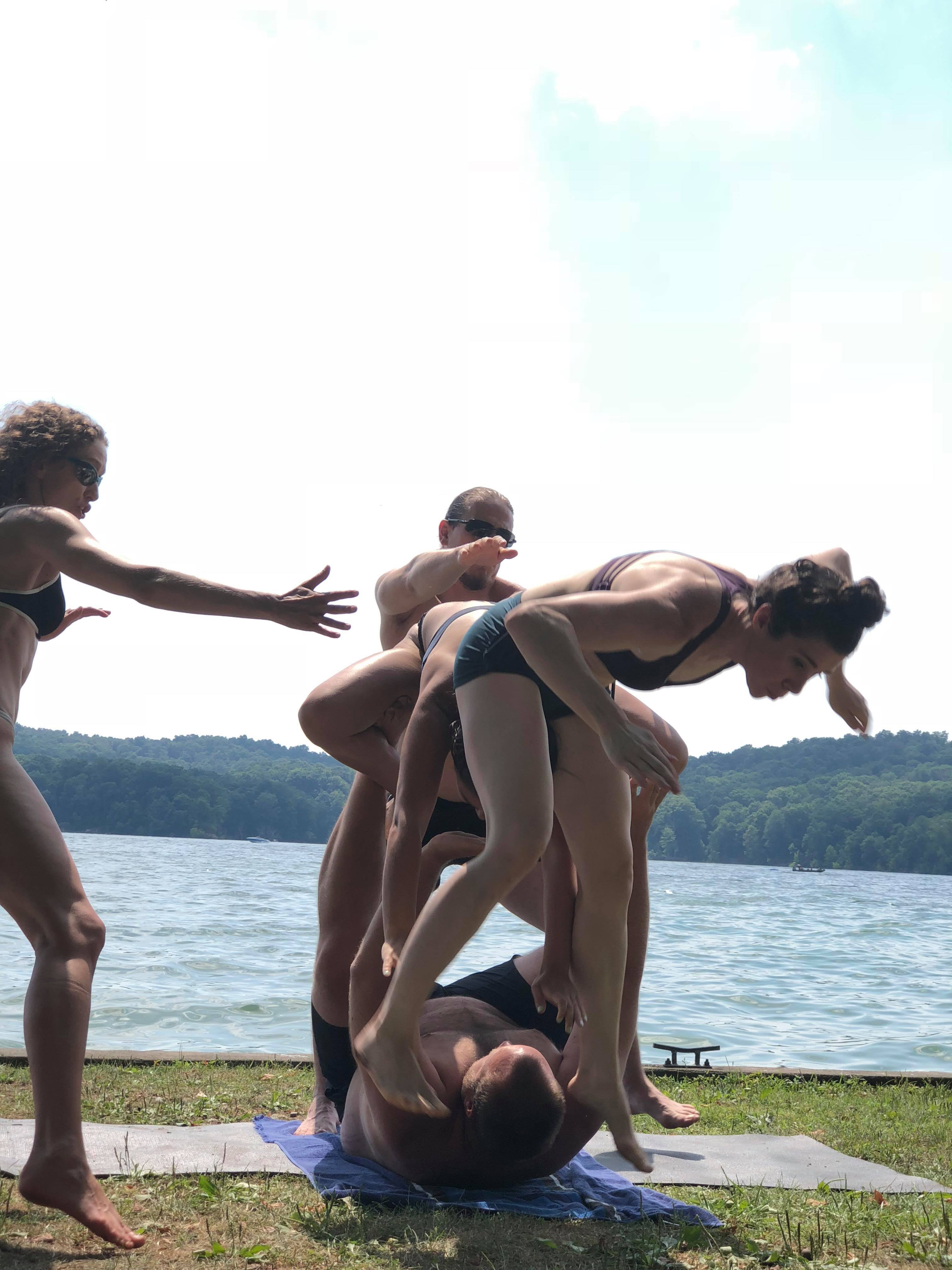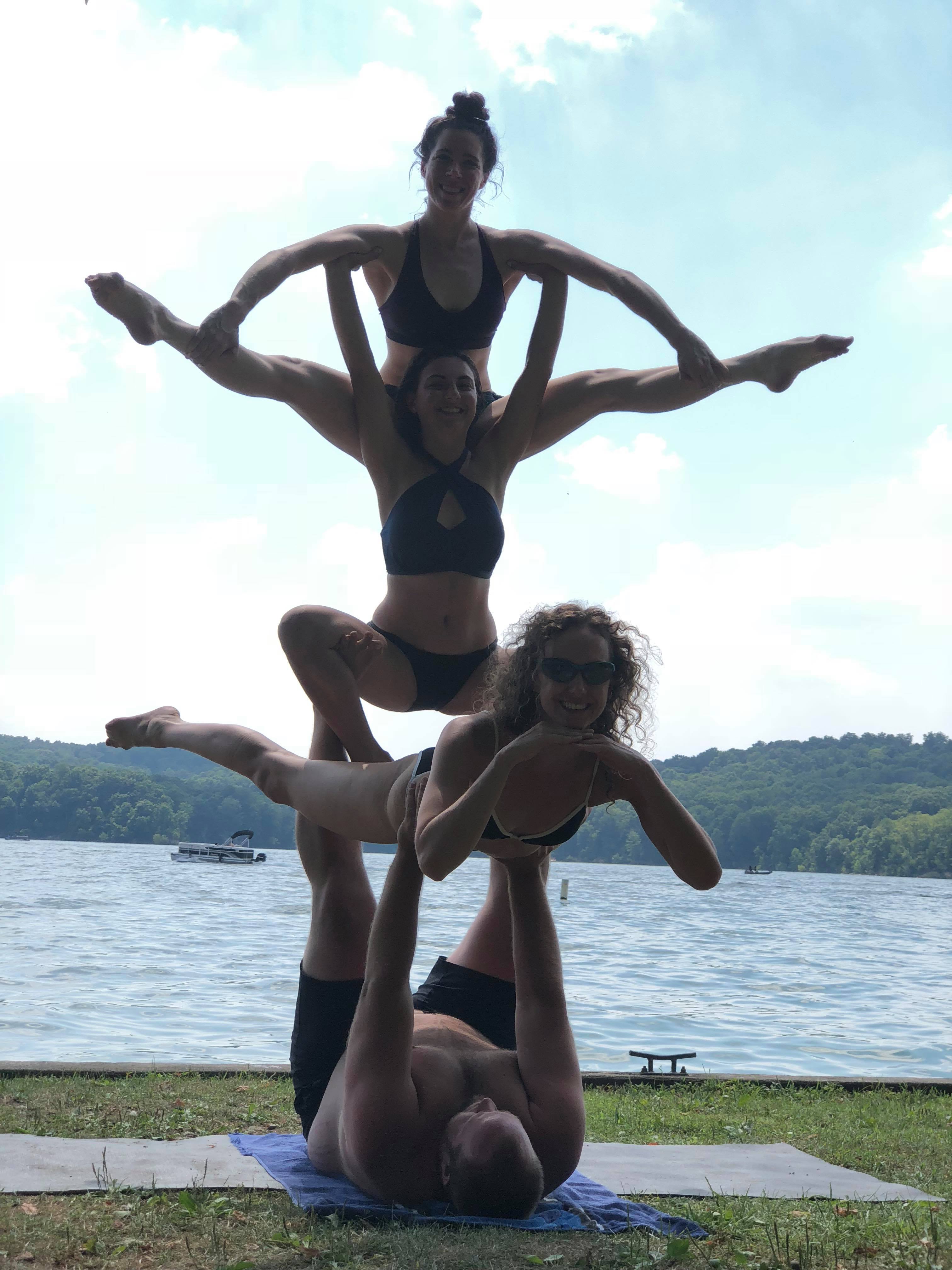 @eveningart The hard part of the 4 person pose was getting the very top person up. First thing was putting the person on my legs into throne and then the person all the way up top stepped on my thigh to gain enough height to where the person doing throne could put her hands under her arms, and then she pressed it the rest of the way up. The press is the hardest part as it is the easiest point to lose balance. Once it is up it is pretty easy to hold!