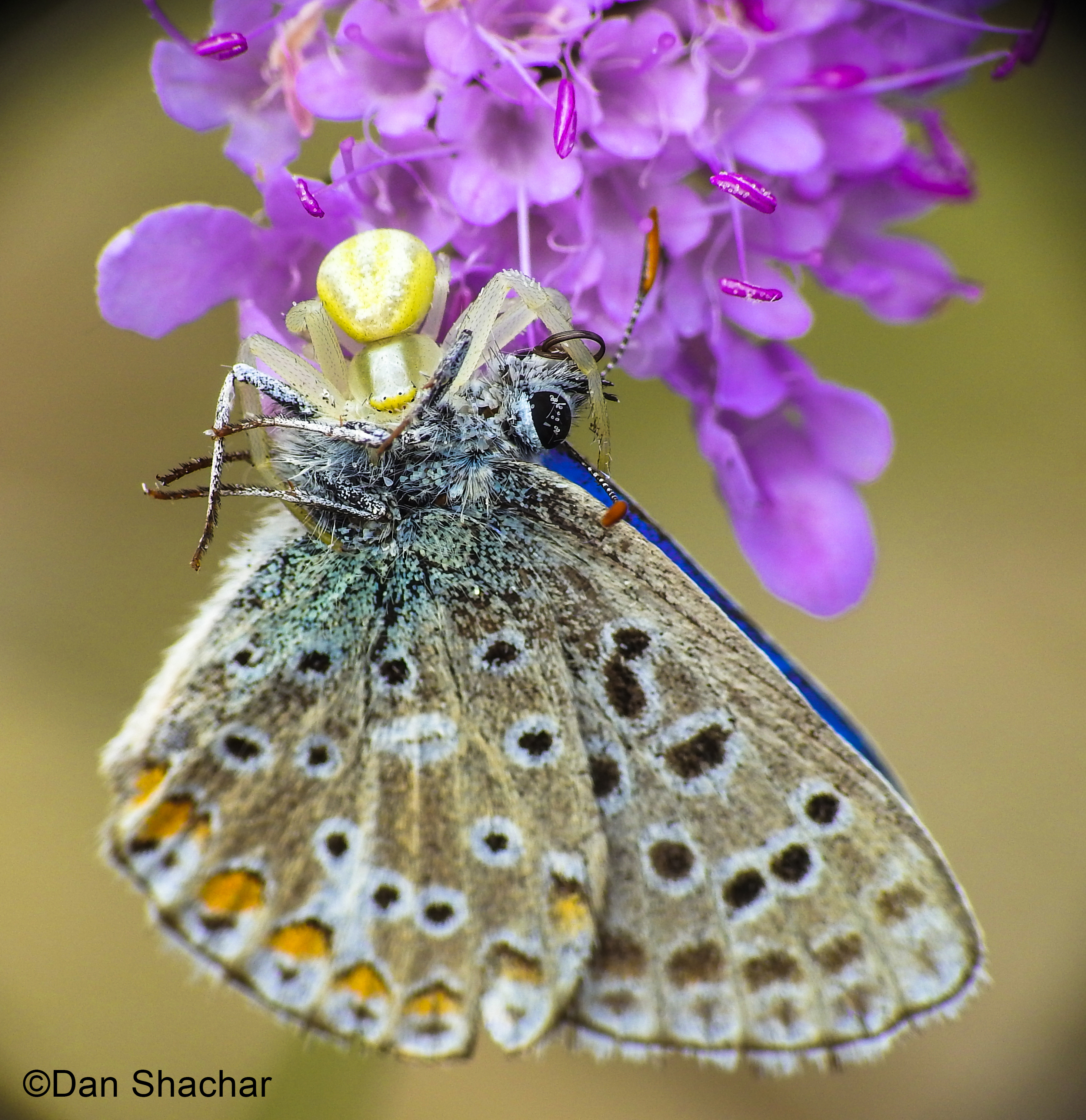 Macro photography - Crab spider hunting a tiny adonis blue butterfly