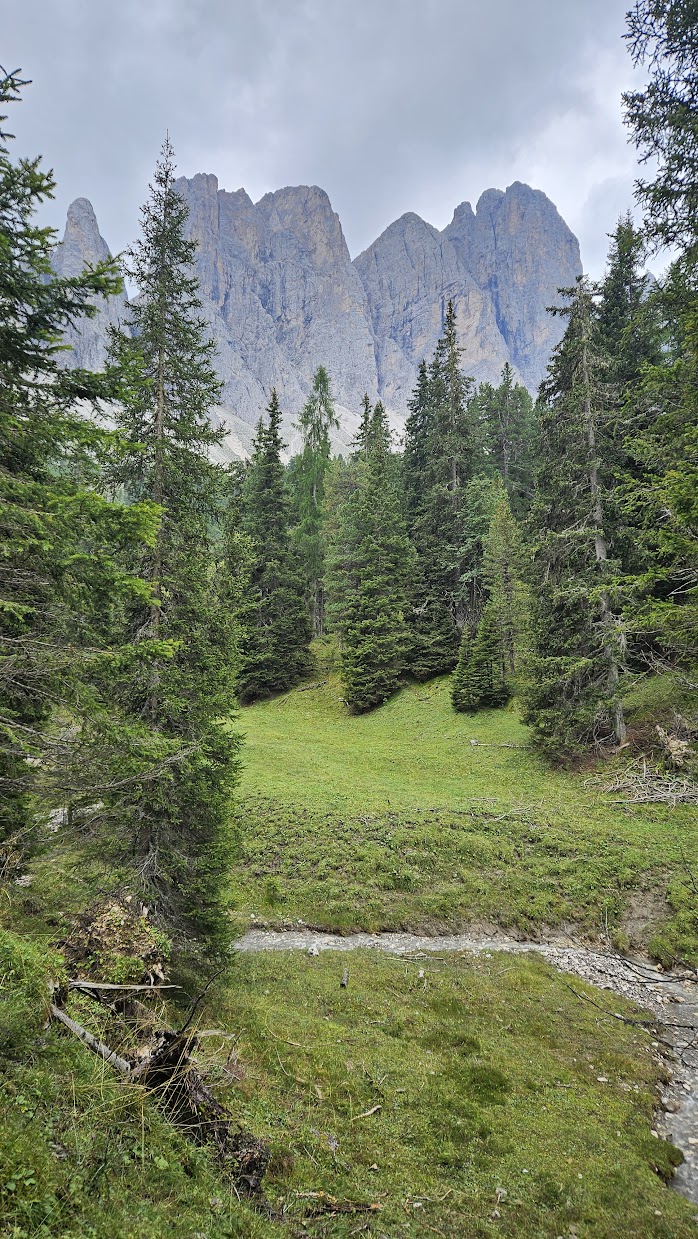 We started along the little-visited trail no. 6. This trail gently climbs through rich forest following the course of the Rio de Funes and then the Rio San Zenon. Although I expected this to be a very easy part of the trek, it turned out to be the most difficult due to the very high humidity around the rivers and the above average temperature for the Dolomites at this time of the year.