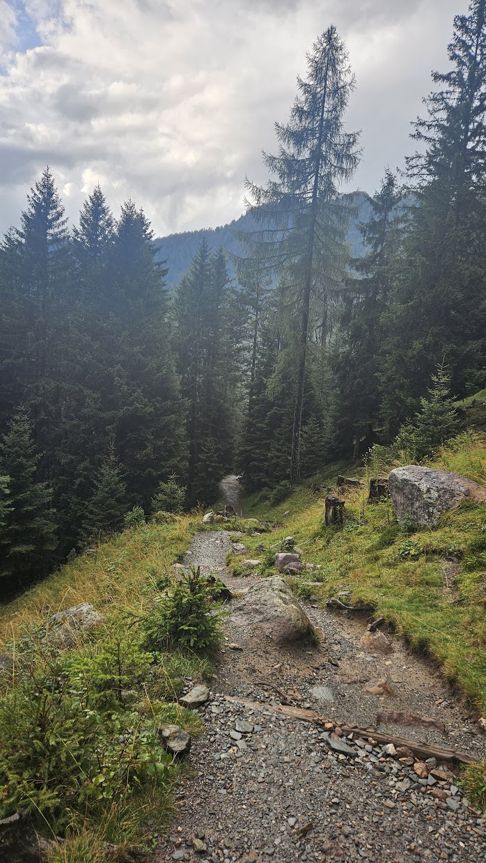 This time, apart from rain, we also had the problem of cold. In the forest, the temperature suddenly dropped to only ten-ish degrees above zero, and Maya was already quite wet. So I made her put on literally everything I had in my pack and picked up the pace to where it was safe for her. We continued our journey through beautiful Dolomite forests to the parking lot and the warmth of the car.