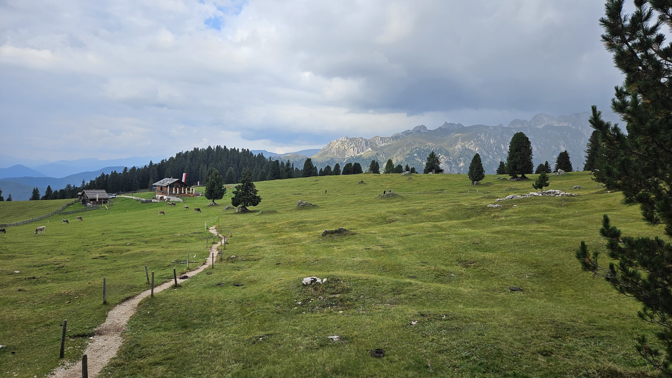 At the intersection with trails no. 34, 35 and 36, we chose to go up the path no. 34 to a small hill on which there are a couple of mountain lodges with a divine view. It doesn't really matter if you choose track no. 36, both lead to the same place, but maybe path no. 36 offers a slightly more open view of the surroundings. As I said, there are mountain lodges on the spacious meadow to which both paths lead. The field itself is full of cows grazing idly and watching the hikers on their way. A real paradise.