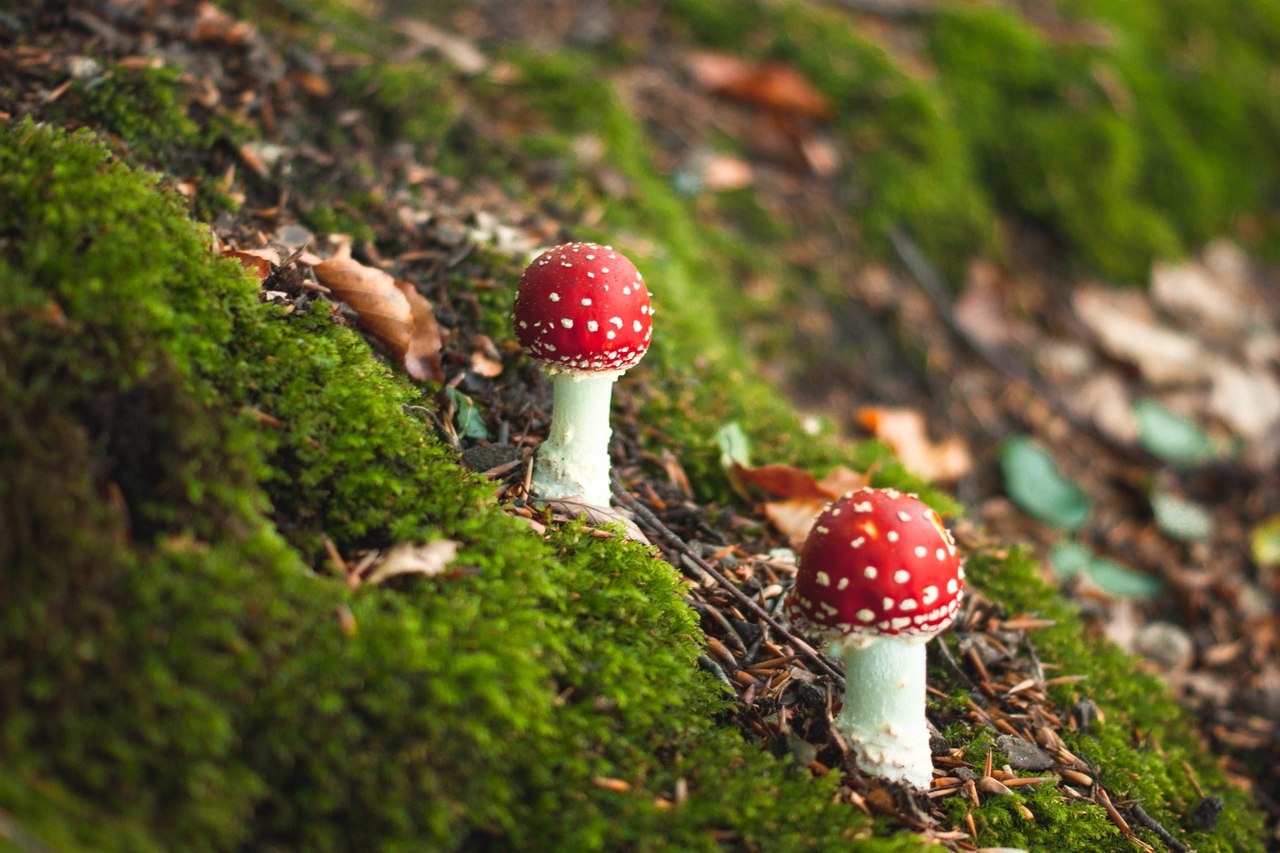 The mountain is covered with a layer of moss. Through the moss grew two fungi, they are called Amanita. I like their colors. Red hat with white circles. These are beautiful mushrooms, but very dangerous. They can not be eaten, they are poisonous