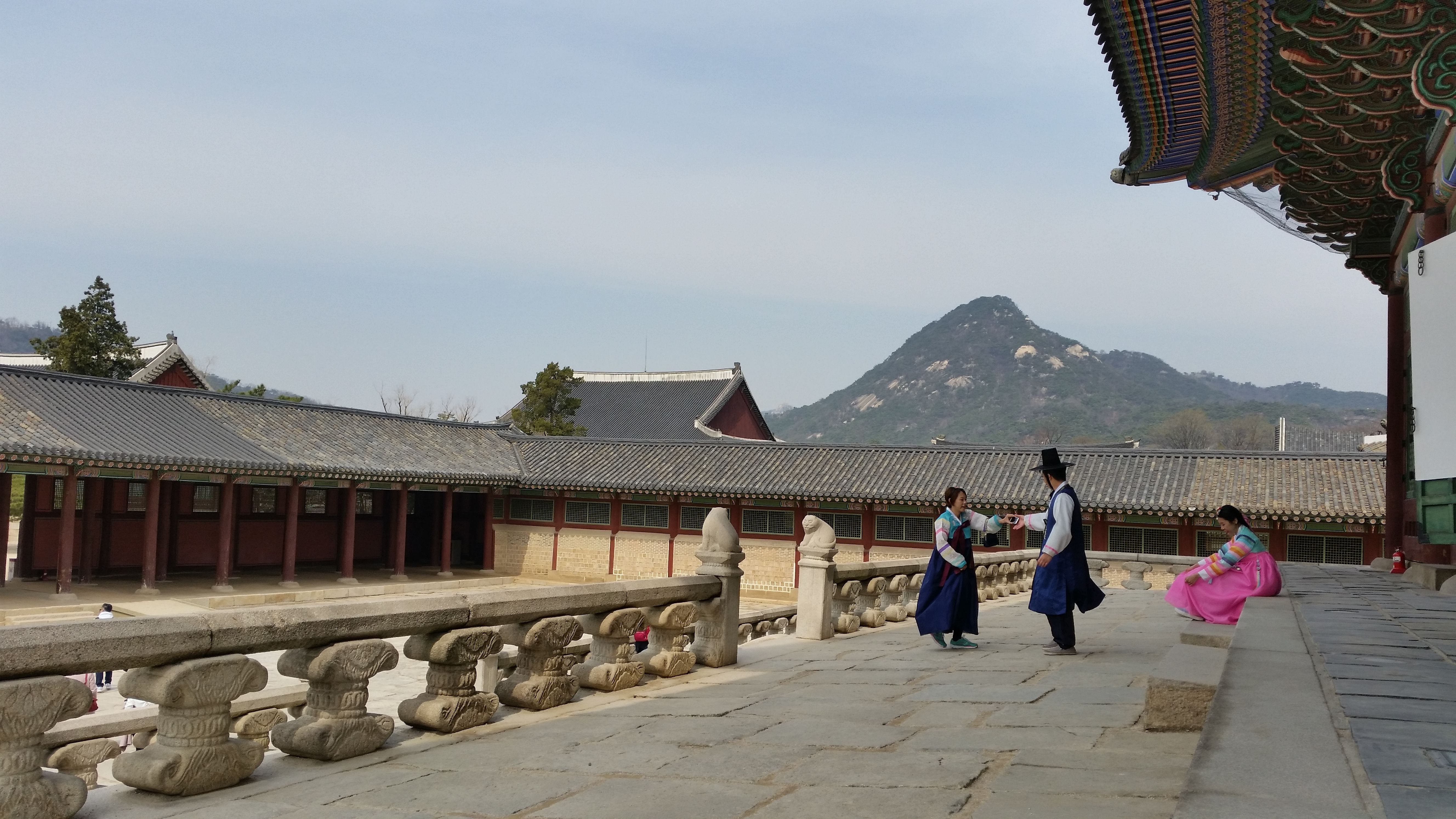People sitting right in a forecourt of the East Palace, which as traditionally the home of the Crown Prince. They are dressed in replicas of hanbok of the Choson Dynasty. (Taken with Samsung Galaxy S5)
