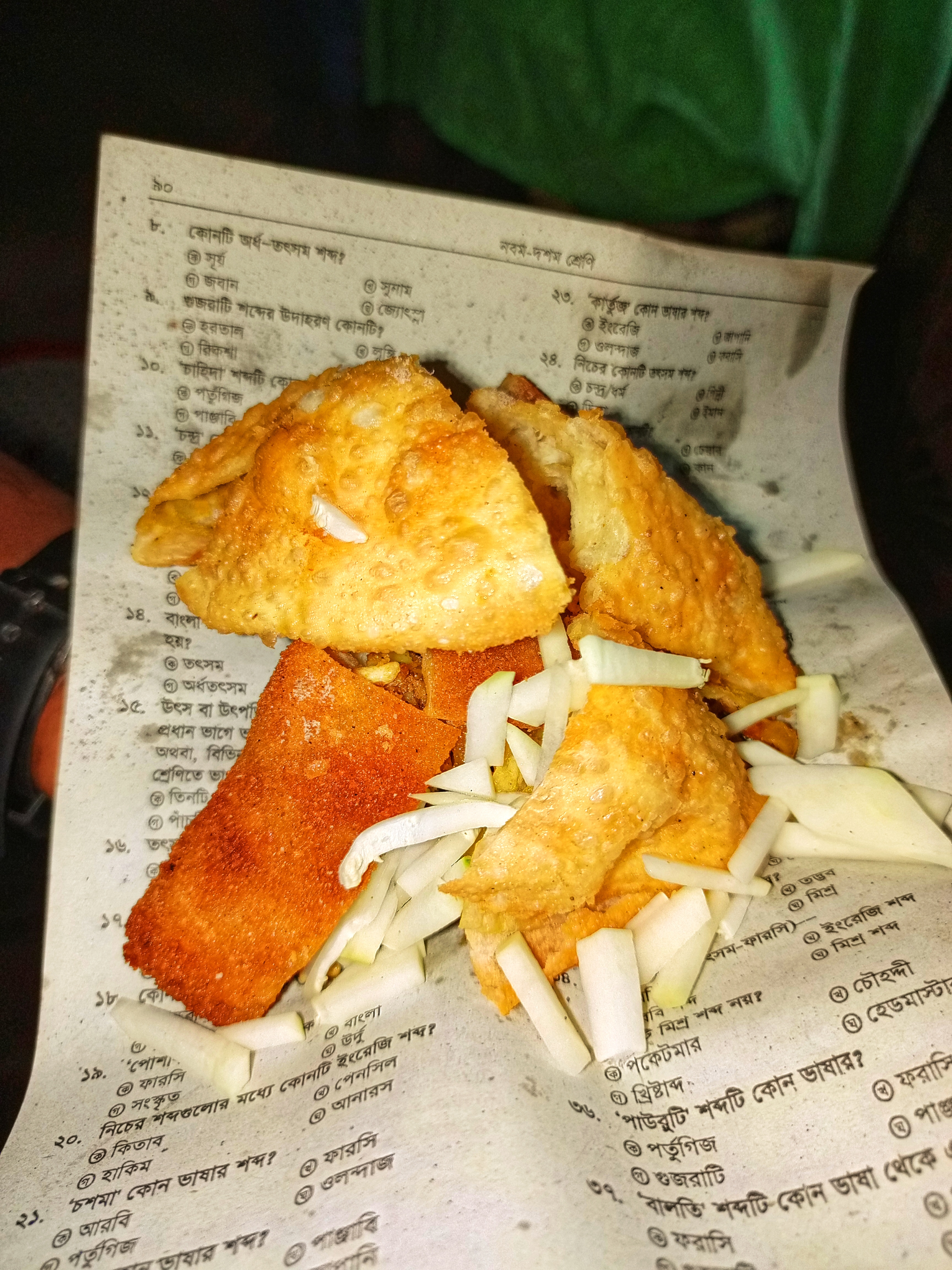 এর ভিতরে রয়েছে পুরি, এবং আরেকটা কি যেন একটা দিল এটা নাম আমার ঠিক স্মরণ নেই তবে খেতে কিন্তু বেশ সুস্বাদু ছিল। মাঝেমধ্যে আমার একটু ভাজাপোড়া খেতে মন চায় তখন সন্ধ্যাবেলায় শহরের দিকে গিয়ে একটু ভাজাপোড়া খেয়ে আসি। পুড়িটা খেয়ে বেশ মজা পেয়েছি কারণ এটা একদম টাটকা ছিল অর্থাৎ গরম, গরম ভাজার একটু পরেই উঠিয়ে আমাদের দিয়ে দিয়েছিল।