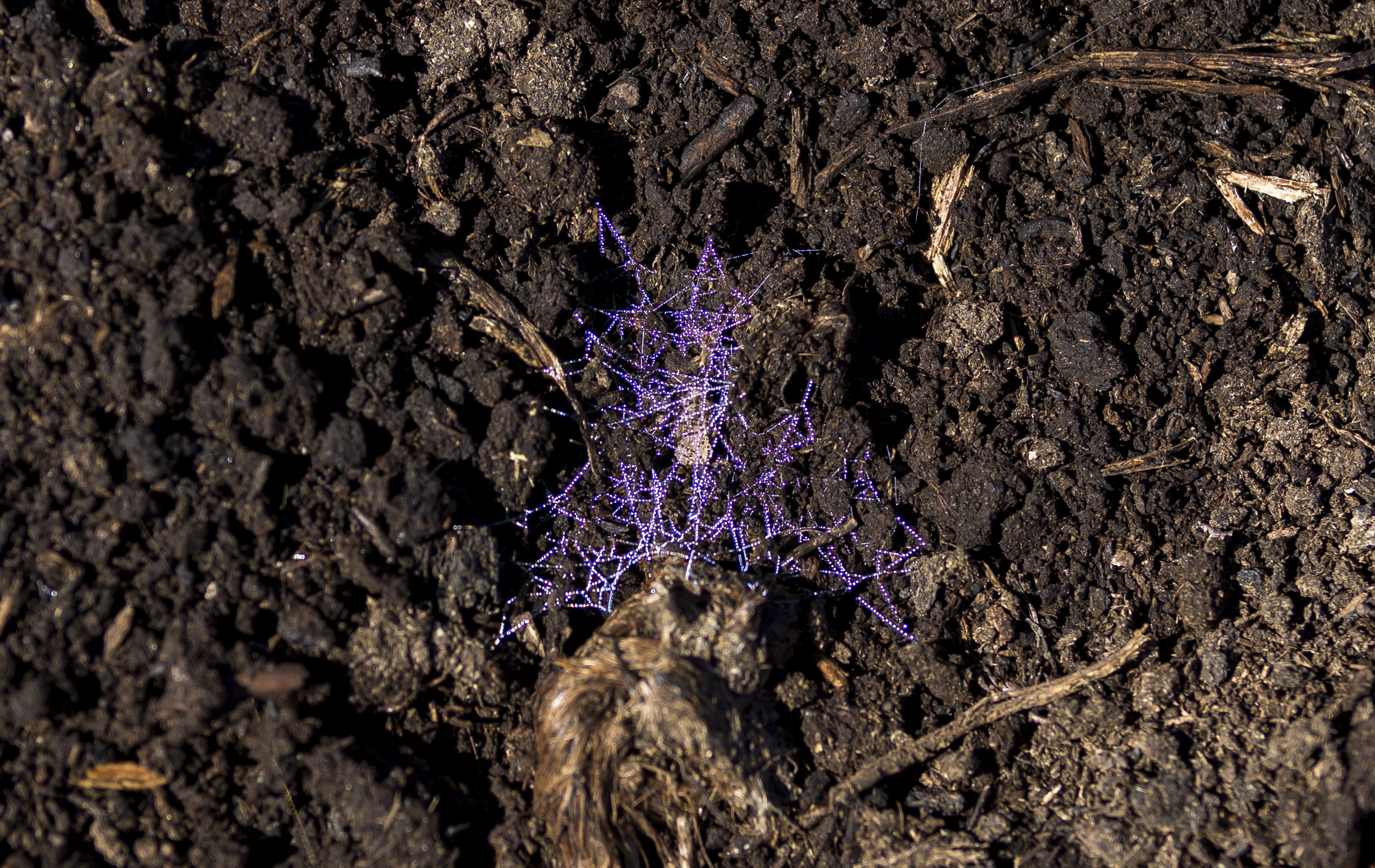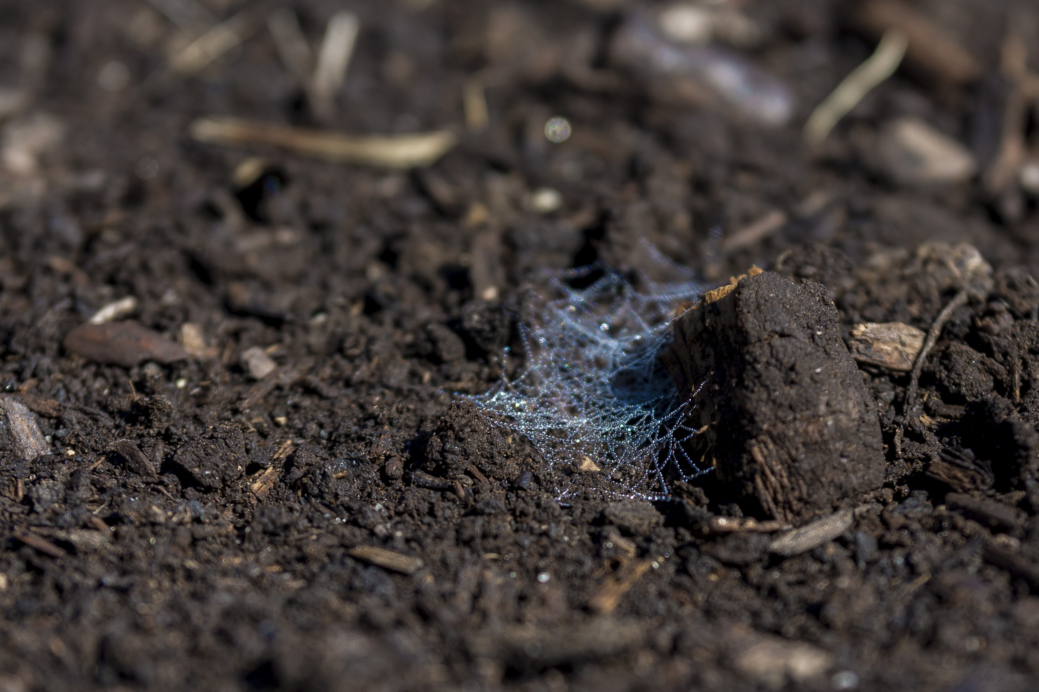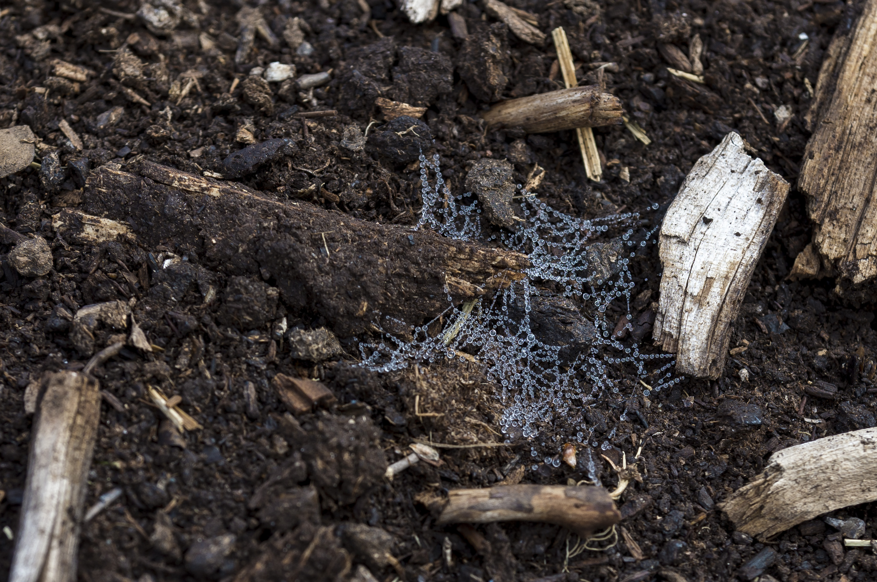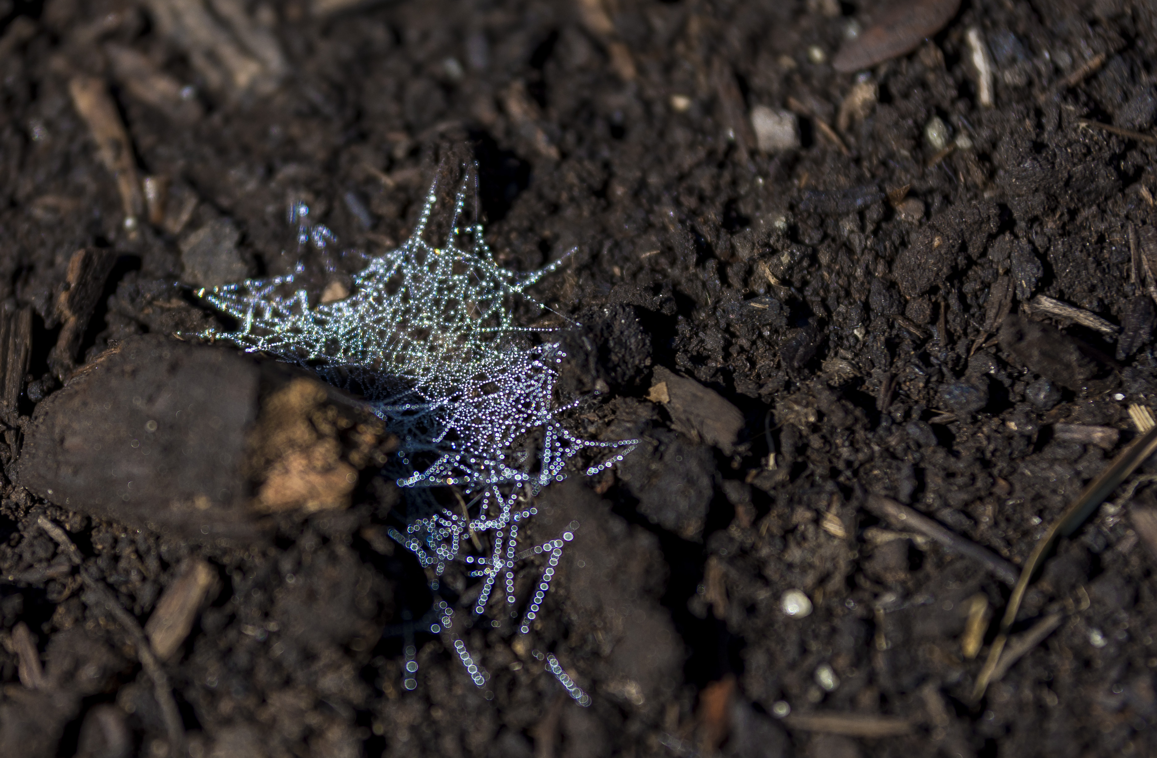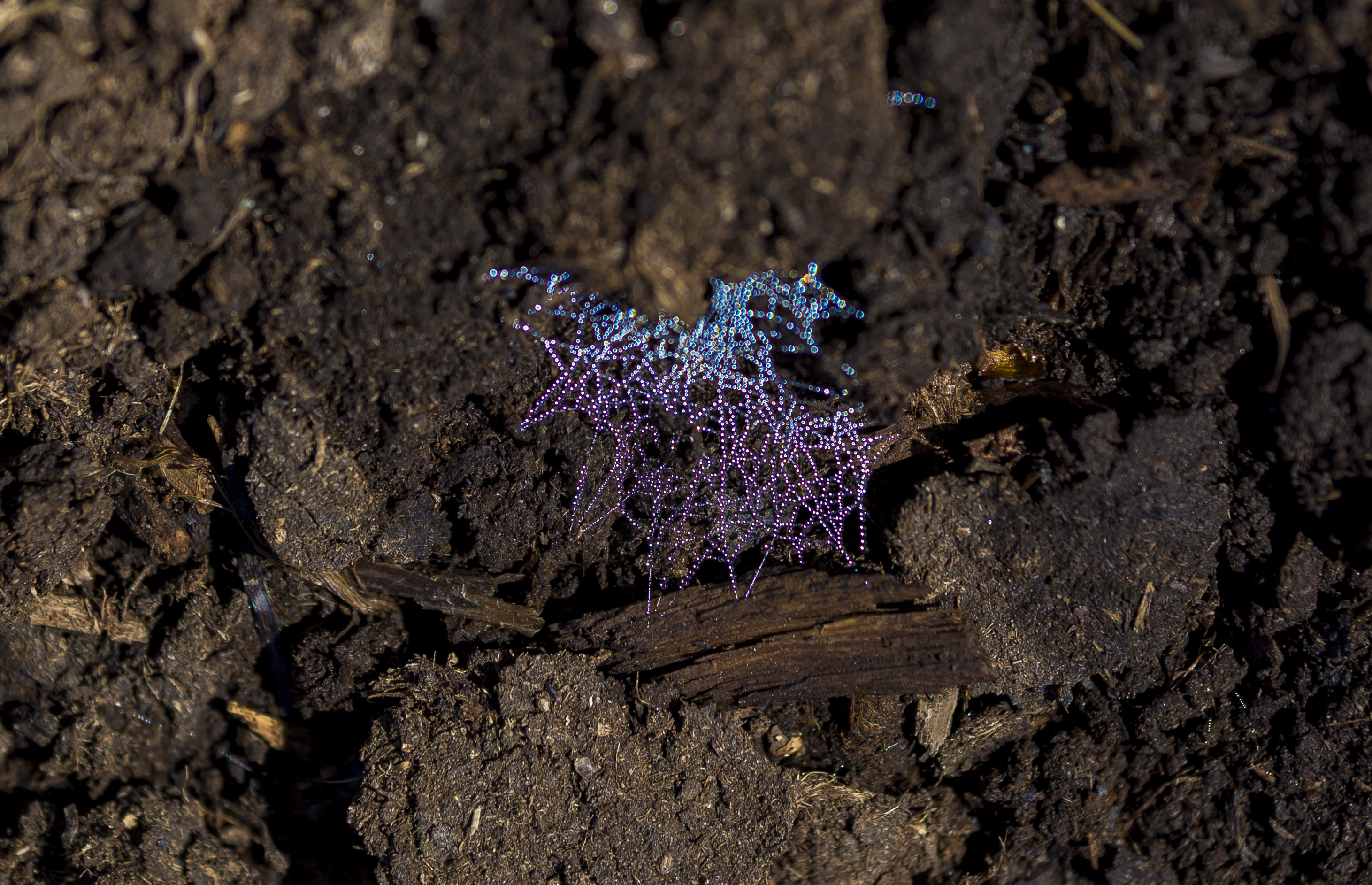 I was walking on the peat bog, and almost stepped on the first little glimmering spider web on the ground. It was right after the rain and the tiny water droplets were reflecting a whole spectrum of colours. Depending on what angle you would look at the web, it would be almost invisible, or really bright and colourful. I was so enchanted by these, that I spend an hour looking at the ground and spotting new webs that were appearing every few meters apart.
