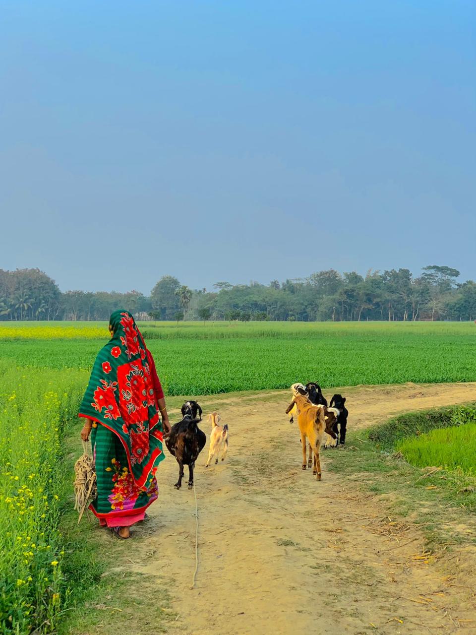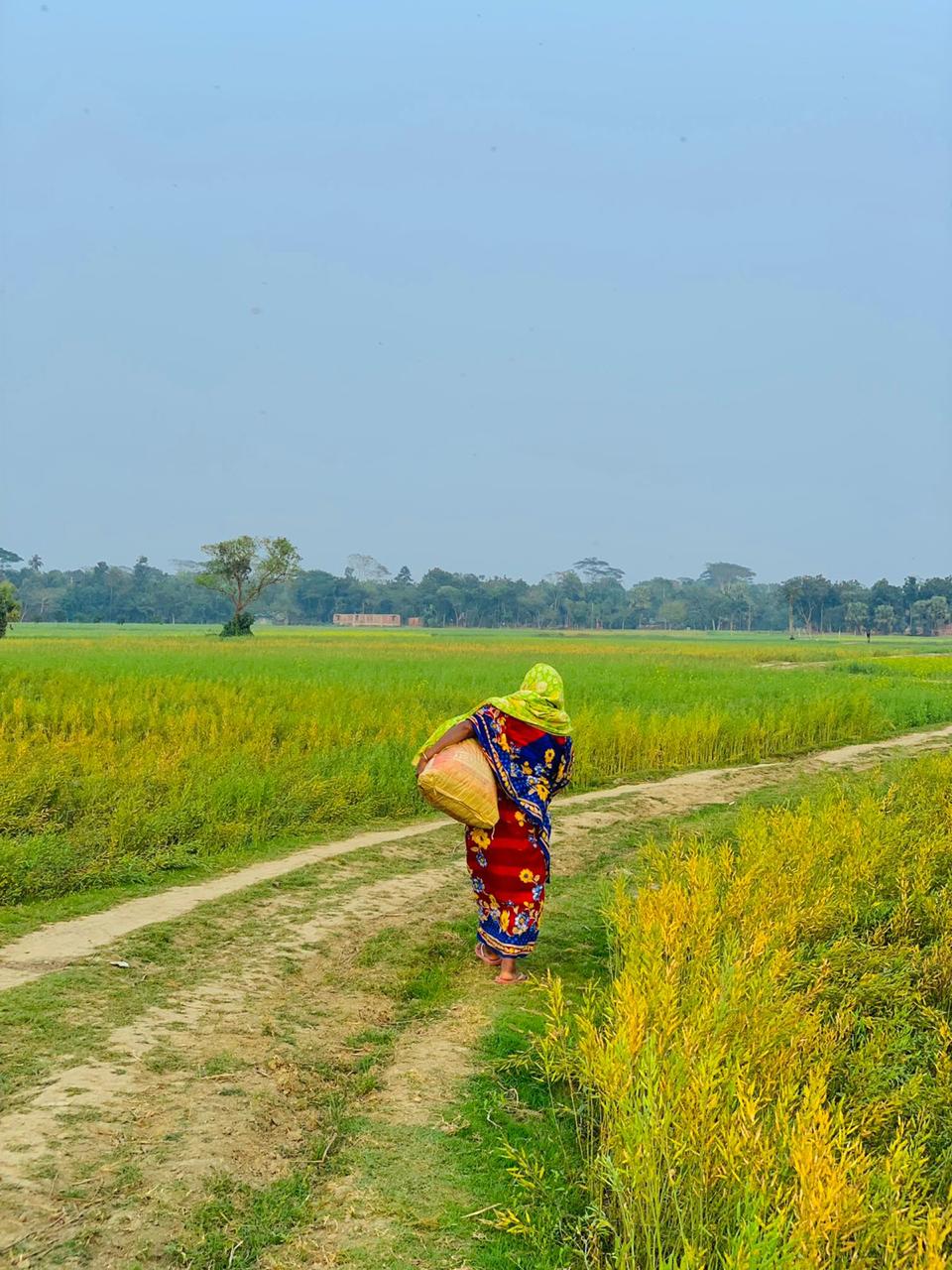 গ্রামের পথে হেটে যাচ্ছেন একজন মহিলা। কি যেন বস্তা বন্দি করে খুব যত্ন করে নিয়ে যাচ্ছেন। পেছন থেকে ছবিটি তুলেছিলা।