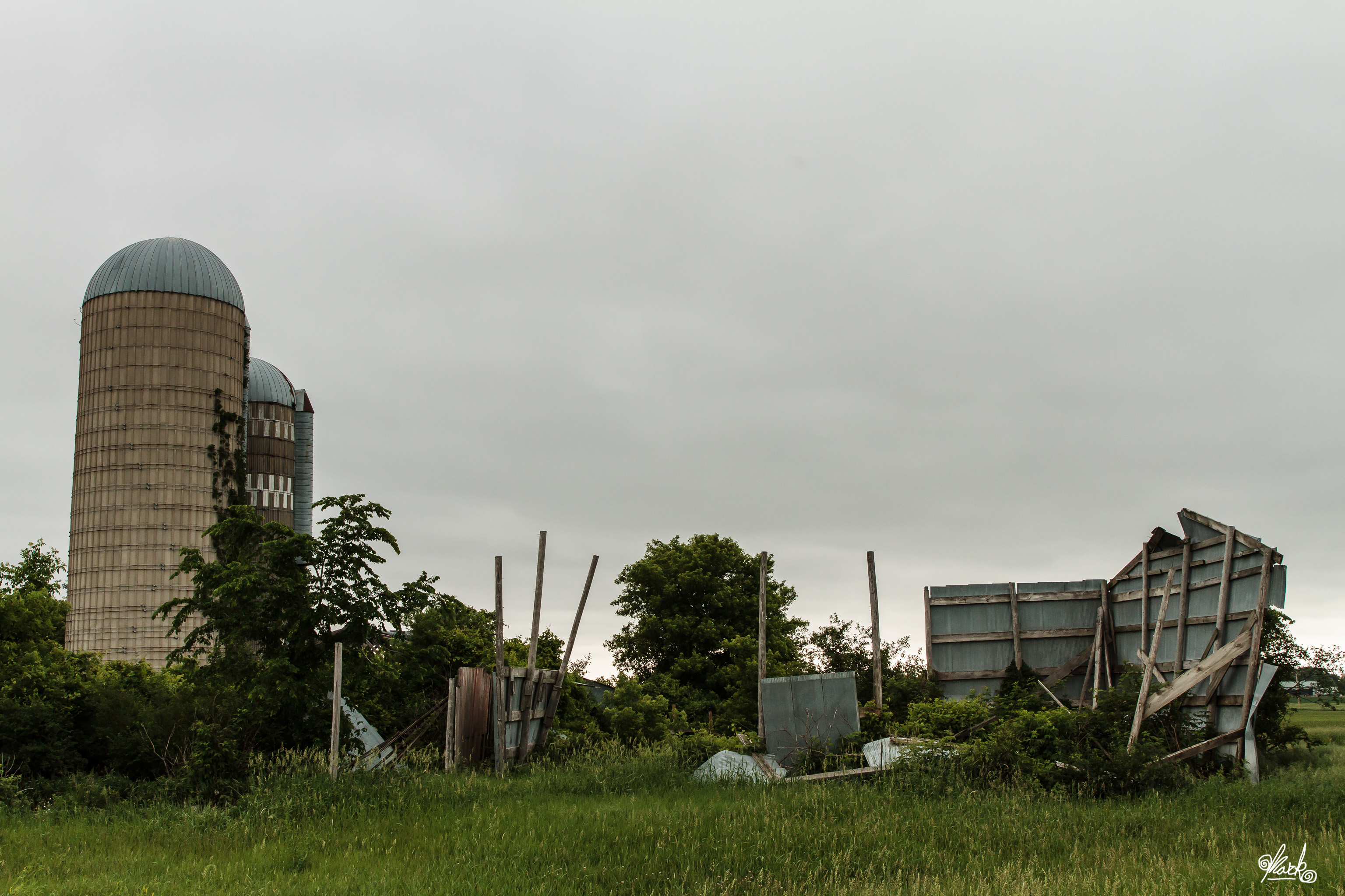 Not much remains of this was-a-barn. The grain silos seem to have held up a little better, though.