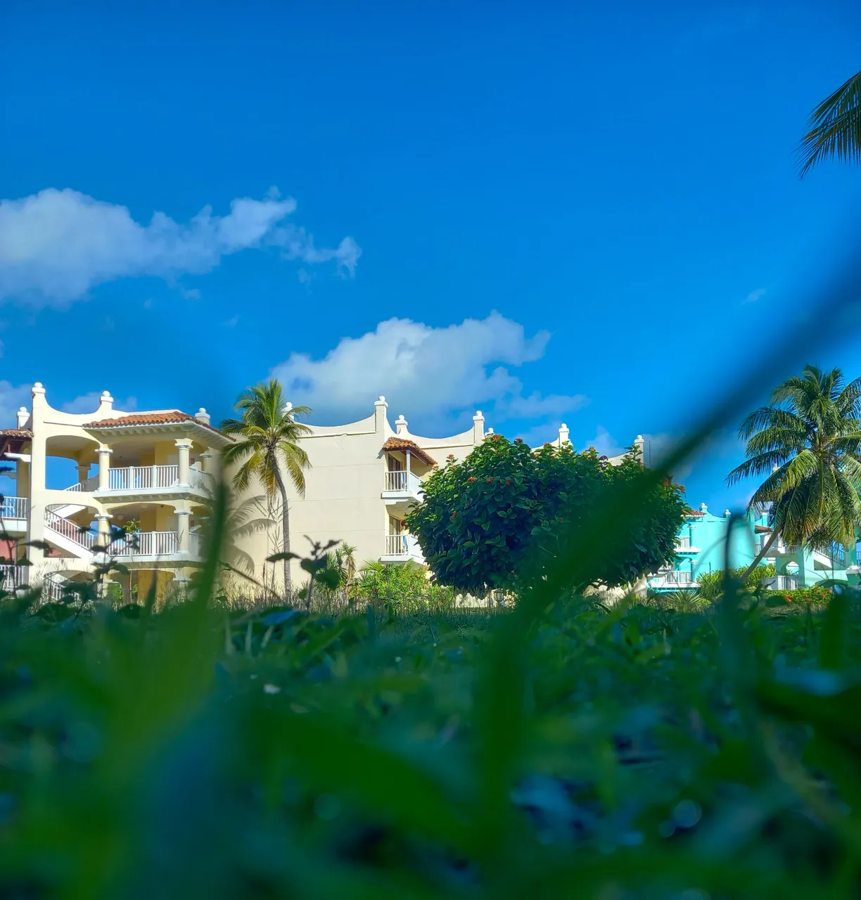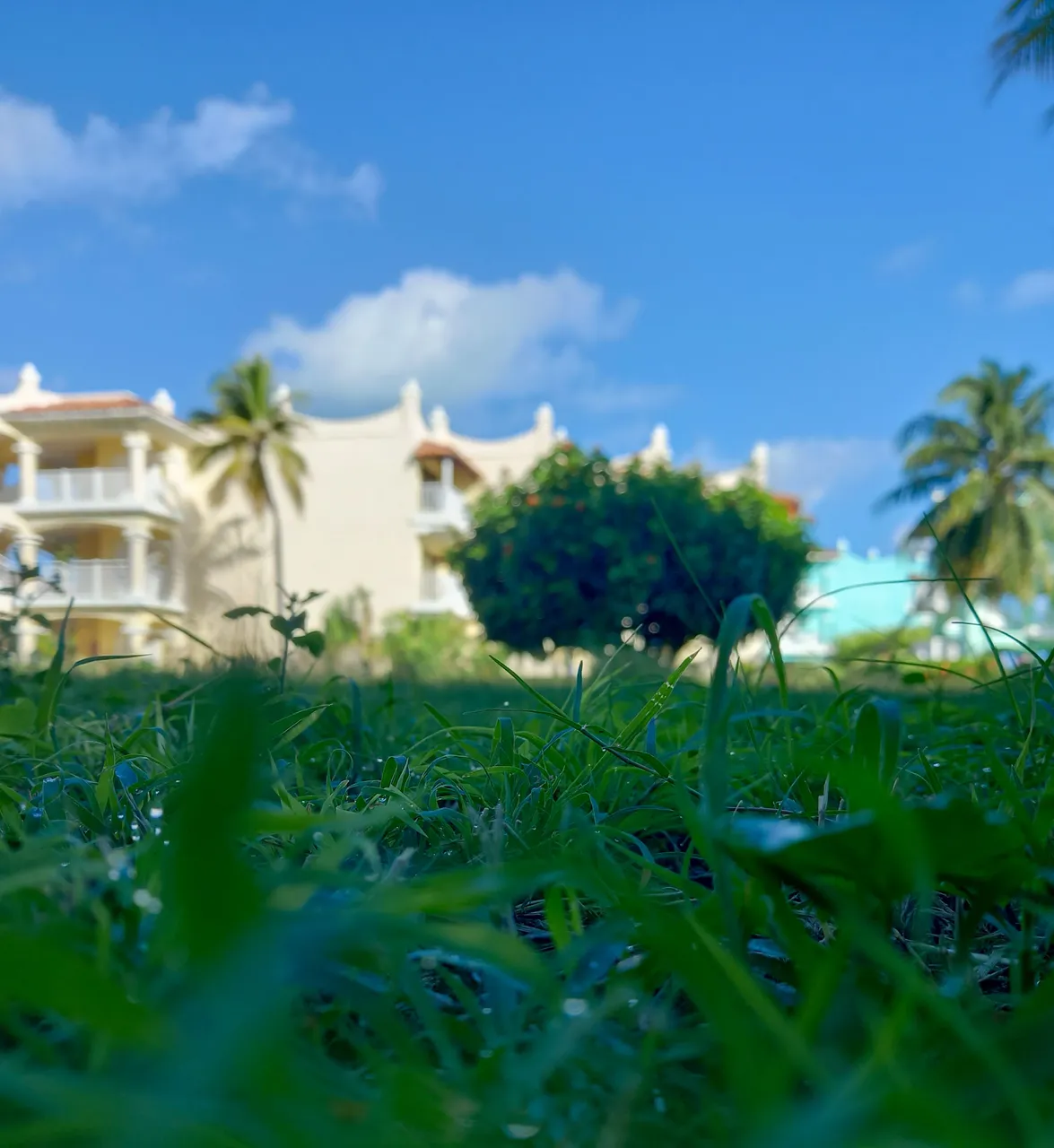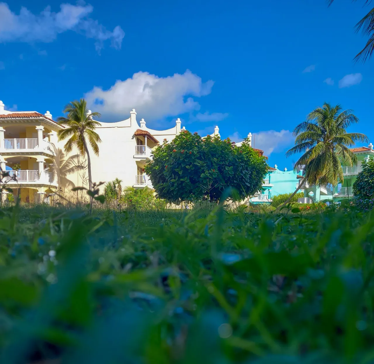 The gardens in this little slice of paradise look like they were hand-painted by nature herself. Beneath a sky so intensely blue it almost hurts to look at, palm trees sway gently while bougainvilleas and tropical blooms splash vibrant color across the white and turquoise facades of the buildings. Every step you take on the grass feels like walking on a living carpet: soft, lush, and such a bright, even green that it almost seems unreal. The contrast between the electric blue sky, that perfect emerald green, and the creamy white of the architecture creates a harmony that invites you to pause time, take a deep breath, and simply exist in the middle of so much beauty.