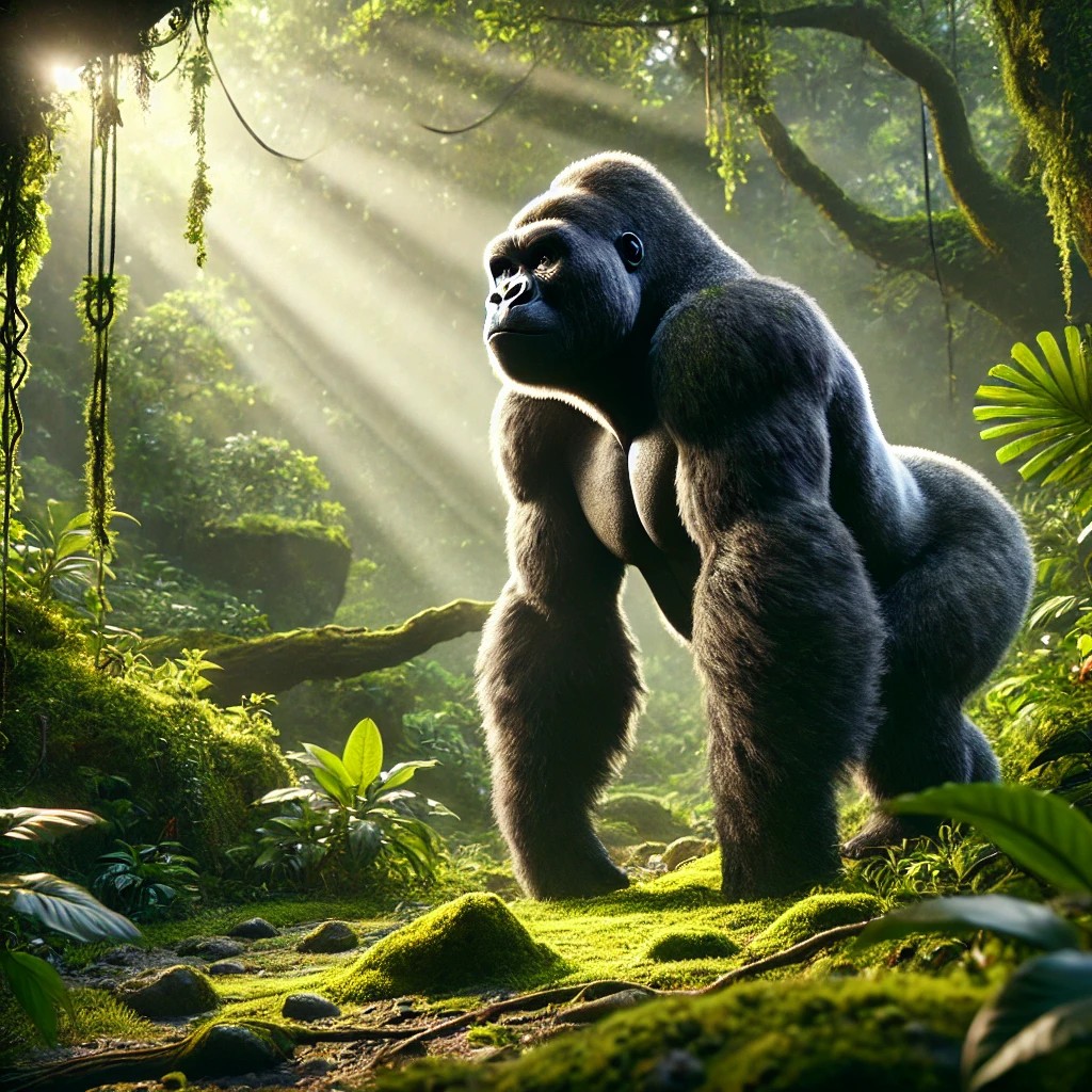 Gorillas are one of the largest primates in the world, known for their stocky bodies, thick black fur, and expressive faces. Gorillas live in the tropical rainforests of Africa, especially in Central Africa. They are herbivores, eating leaves, fruits, and plant stems.