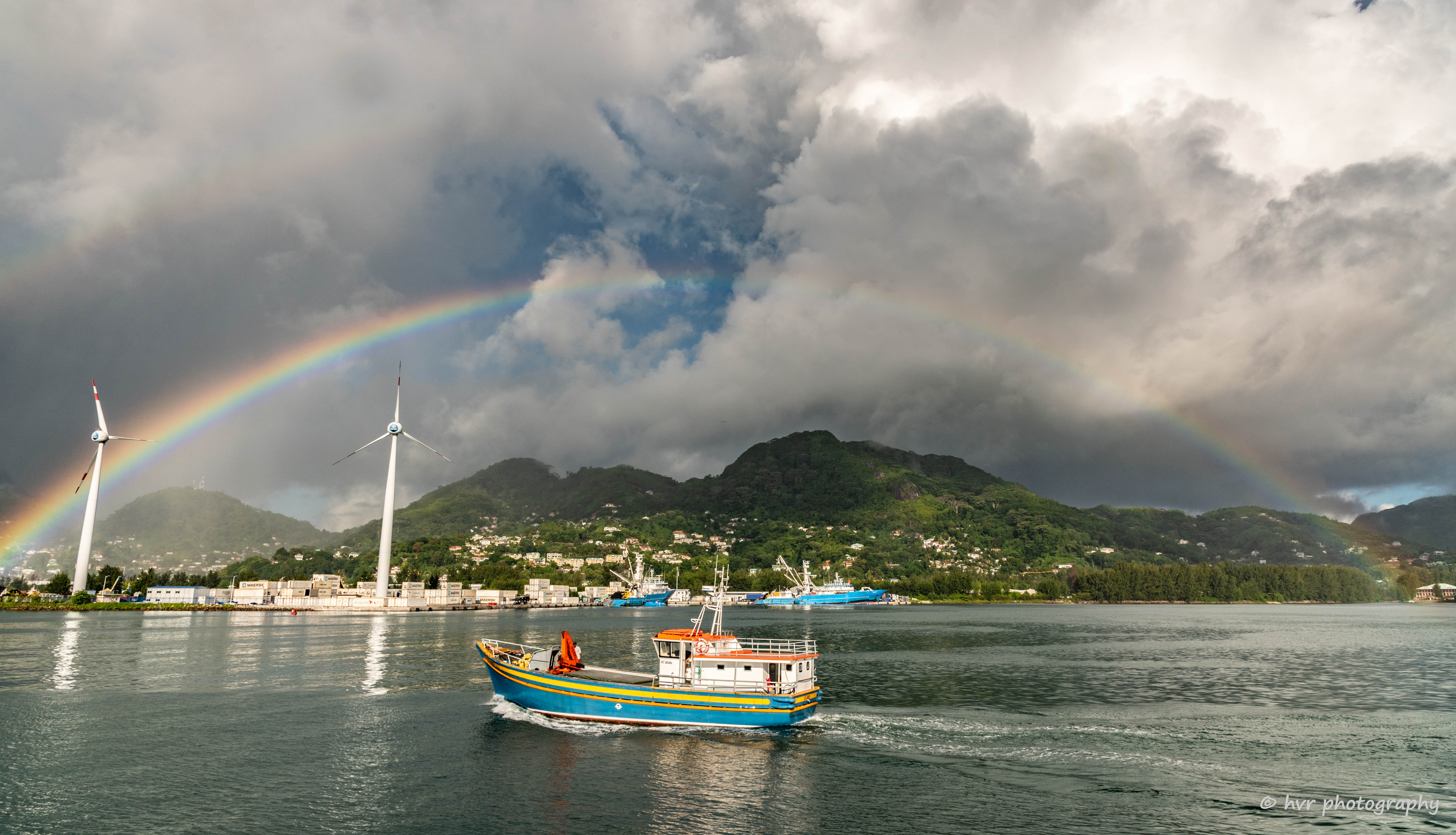 Seychelles – Victoria: After Rain Comes Sunshine … Or an Impressive Rainbow. Photo taken after leaving the harbor of Victoria