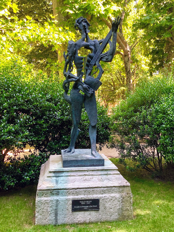 Le poète du jardin du Luxembourg. Cette sculpture du russe Ossip Zadkine (1880-1967), l’une des figures marquantes du Montparnasse des années 1920, rend hommage au poète Paul Eluard. L’étrangeté de l’œuvre tient à sa forme pas encore abstraite mais plus vraiment réaliste, comme l’illustrent les espaces évidés de la sculpture et la végétation de bronze grignotant la jambe du poète