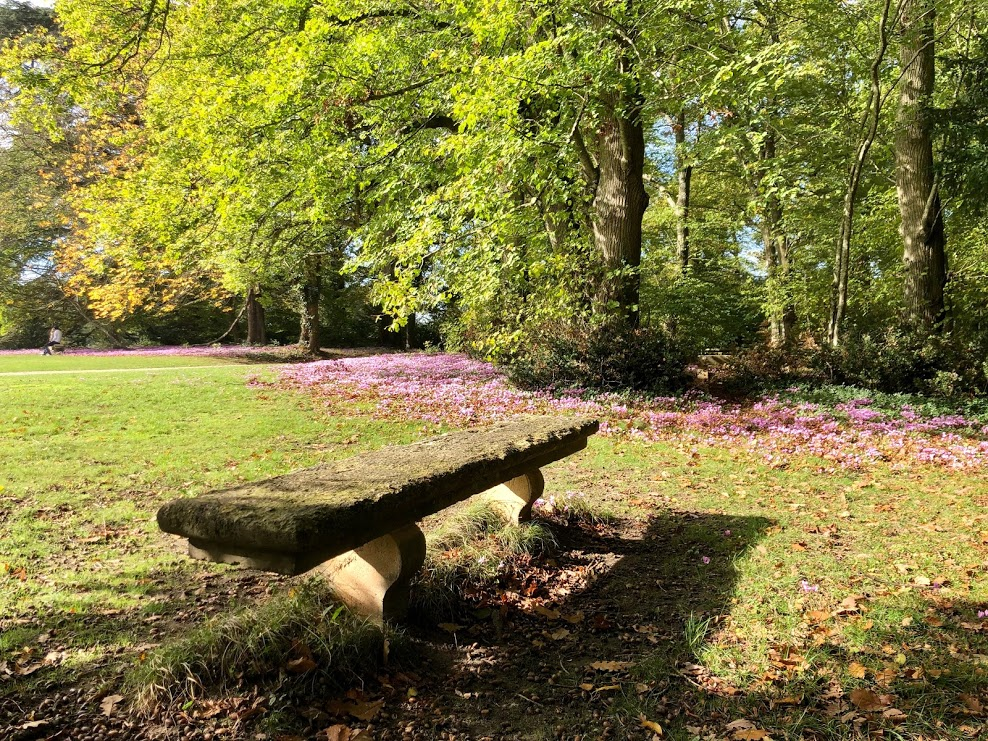 Le château de Breteuil à Choisel - un banc et un parterre de cyclamen