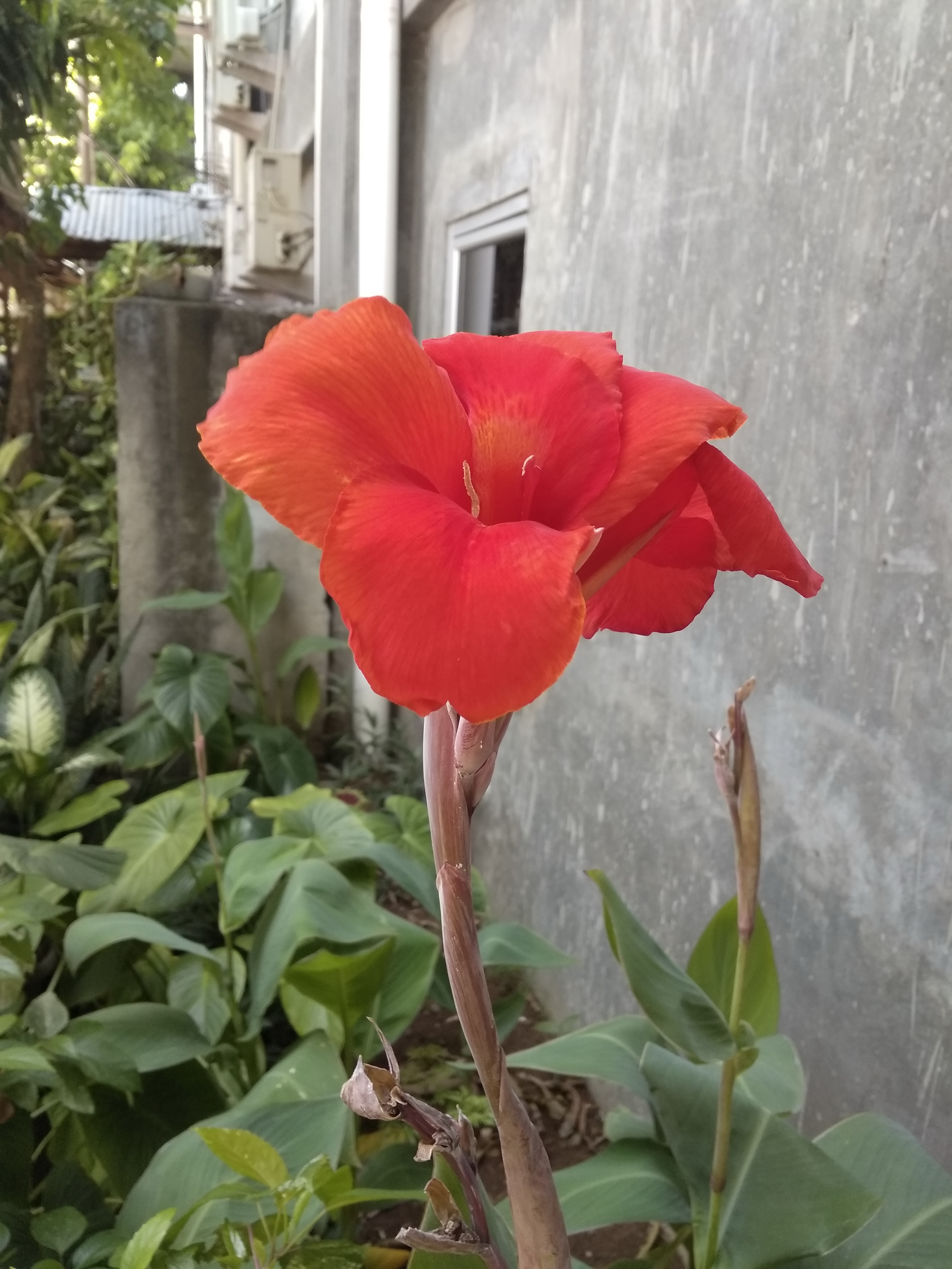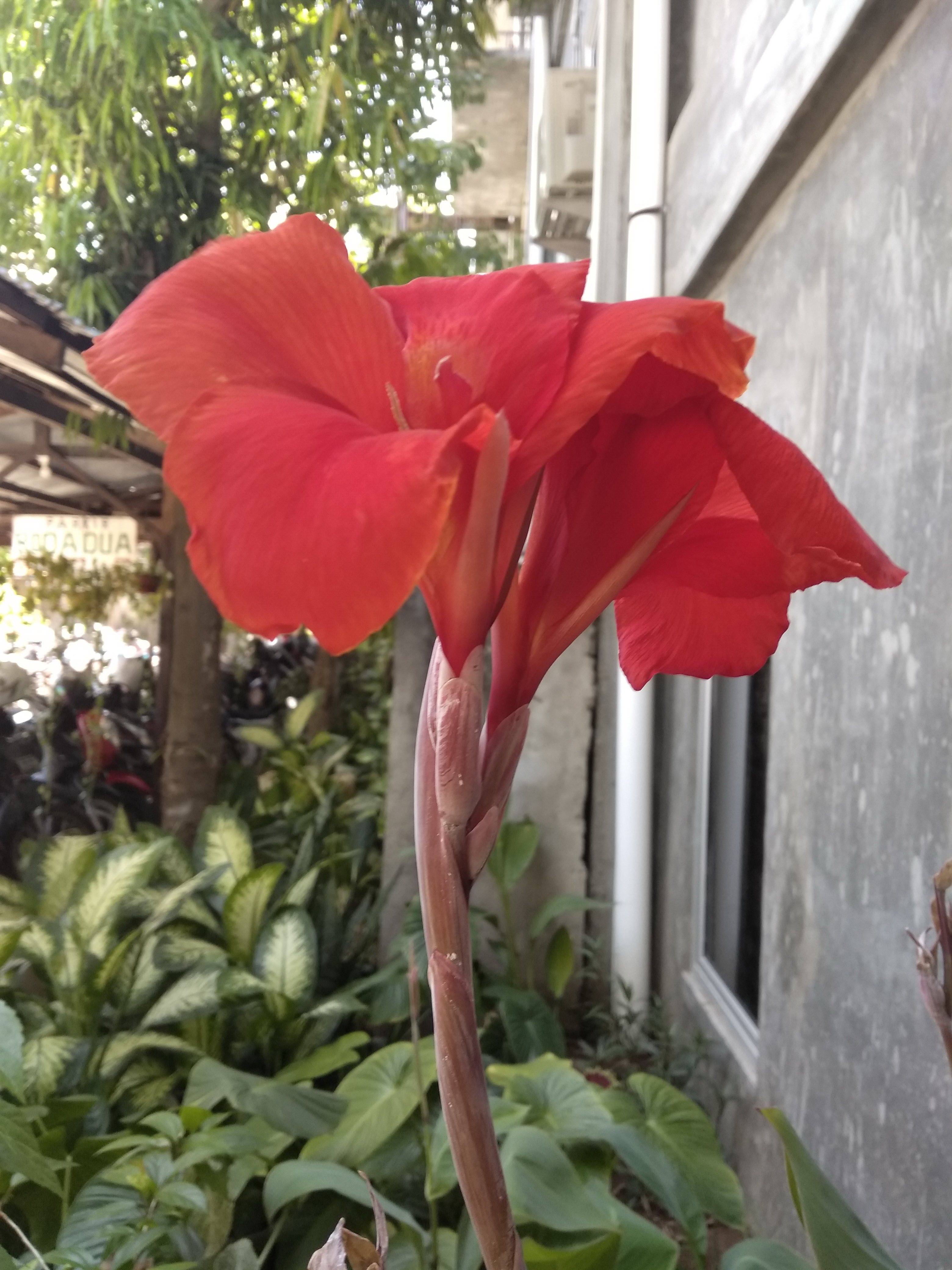 I took a picture of this flower two days ago, when I took part in an event at one of the hotels in my city. This orange flower is located at the back of the hotel, I'm interested in seeing this flower grow with a single stem. The height of this flower stem is almost one meter. With the color of the maroon's flower stem and orange shoots of flowers, and also surrounded by green flowers it adds to the beauty of the flower.