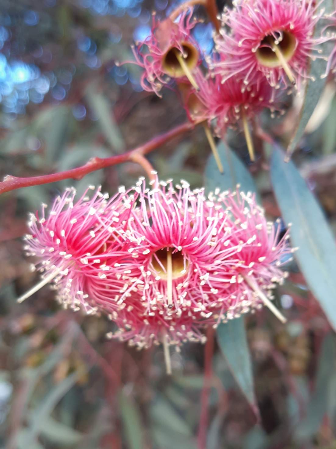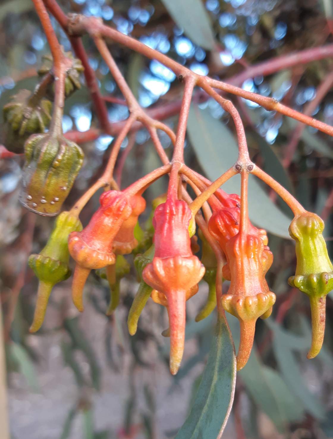 To get the little hats the gum nuts first dry out then lose the caps which then exposes the flower.