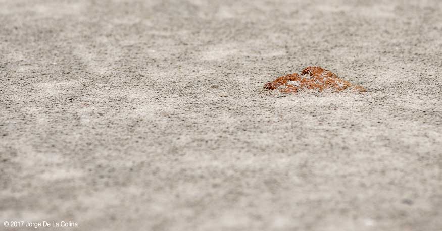 After a while, I decide it’d be best to call it quits and head back in. We had planned to go back to a restaurant and look at our pictures and reminisce on our adventure, so I decided to turn around. I had just walked through a muddy salt flat and decided to go around several bushes where it was dry instead of tracking back through the mud. In the distance I see something sticking out of the ground. I slowly walk towards it, I see the wind blow sand across more triangular edges, sticking out of the sand.