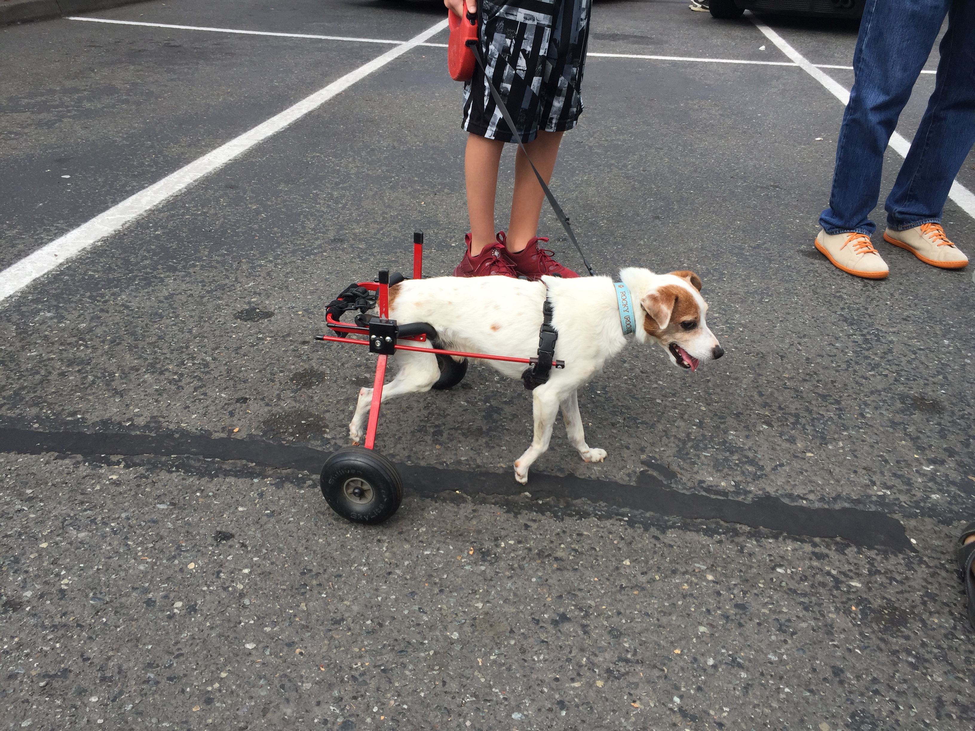 The dog was hit by a car. He had one leg amputated and the other doesn't function well. The wheels are to help him move around on his own.