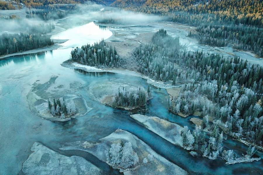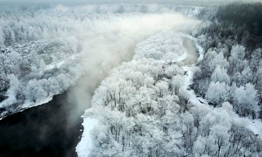 Frosted trees along the banks of the Kuerbin River, Heilongjiang province, Jan 21, 2017. [Photo/Xinhua]