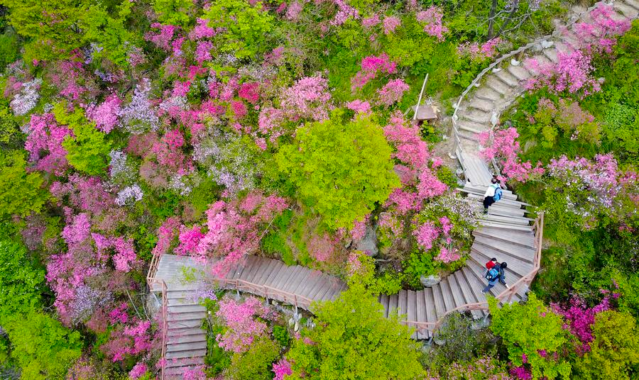 Visitors climb a staircase through the azalea flowers, Yingshan county, Huanggang city, Hubei province, April 21, 2017. [Photo/Xinhua]