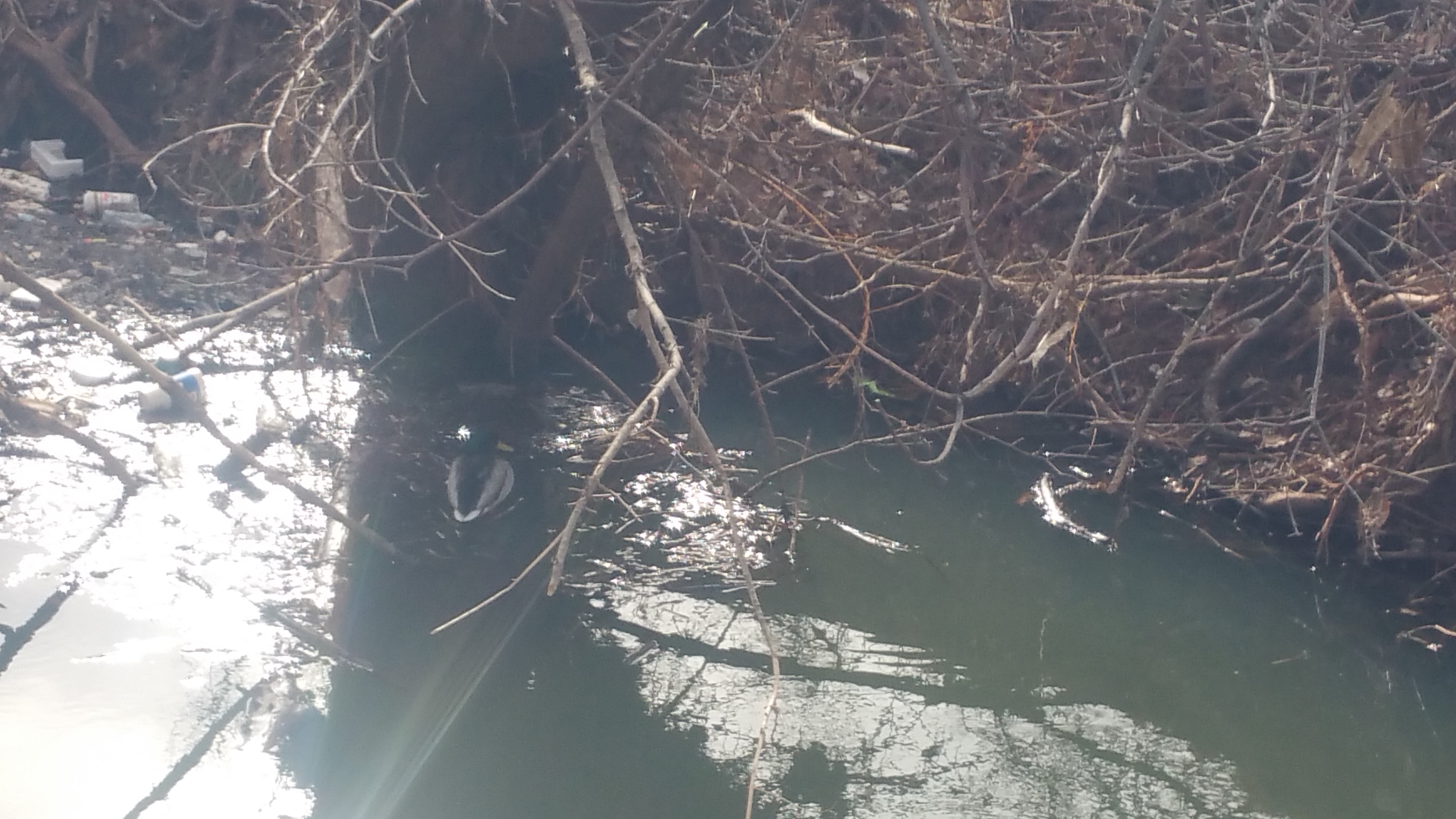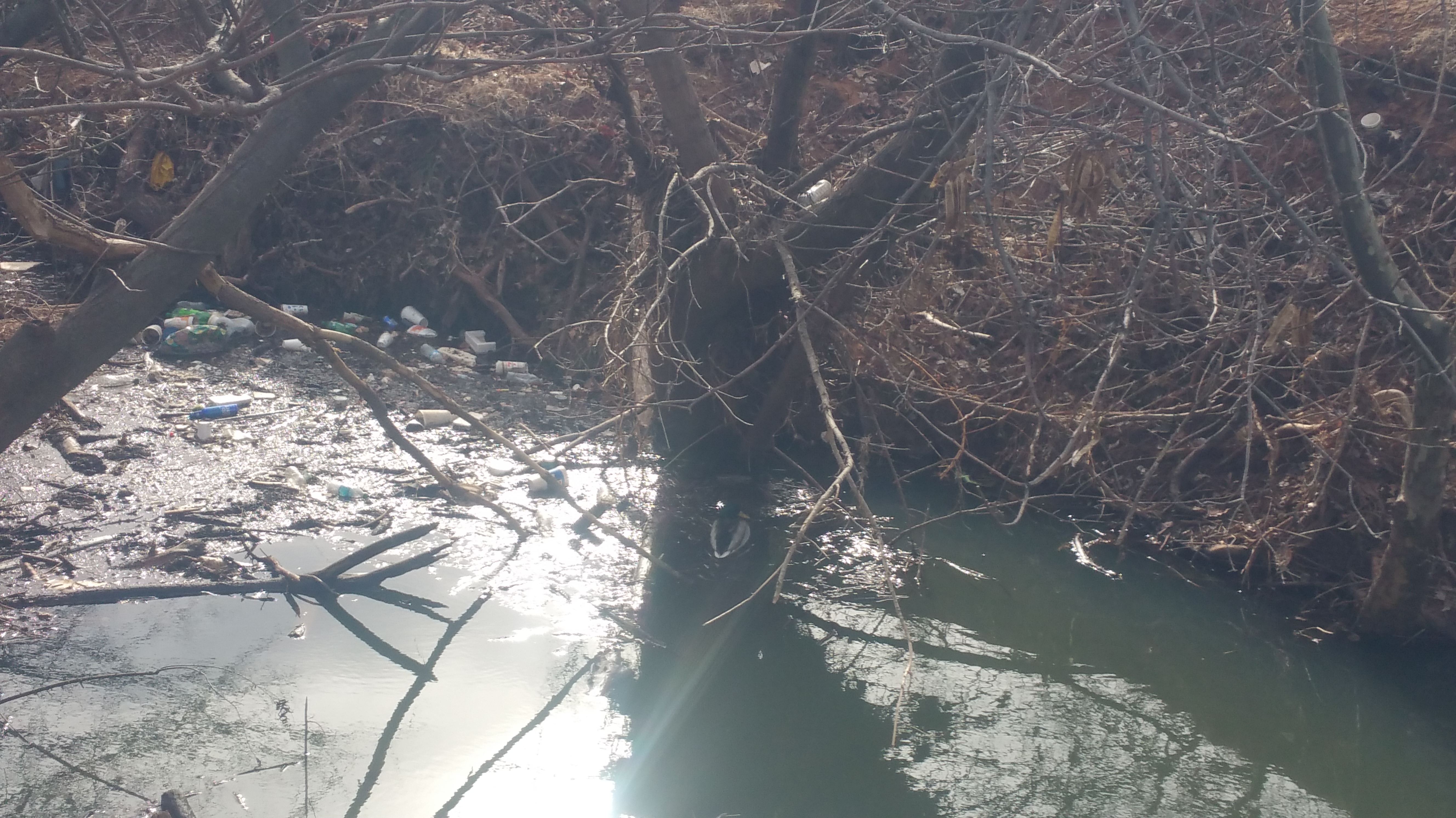 These are a little hard to see, I toke them with a phone and the lighting was bad. This is a creek full of trash with a mating pair of ducks living in it. The ducks are circled in blue. I'm not saying what city this was in because I don't want to give any one city a bad name. Truth is every US city has scenes like this one.