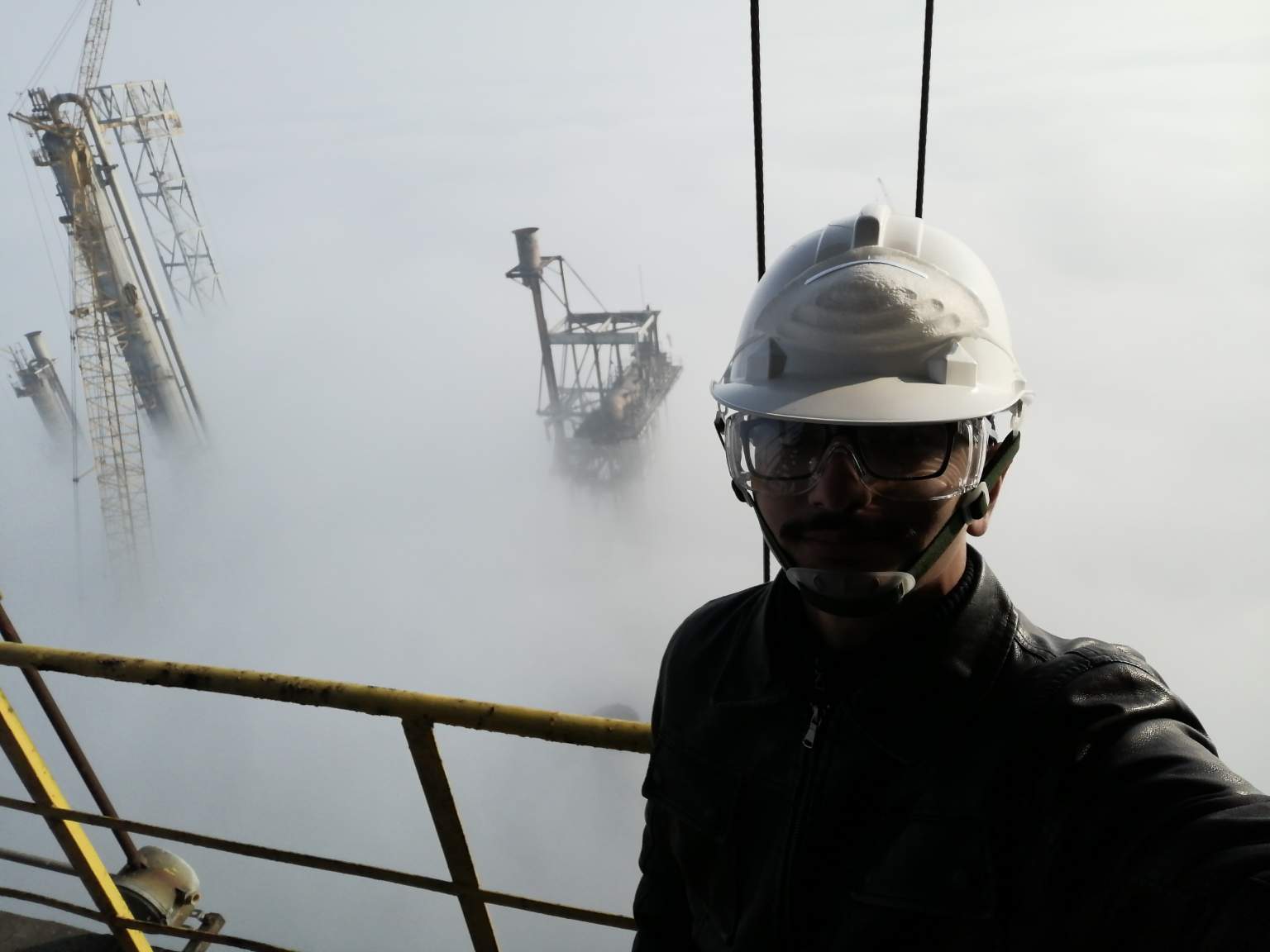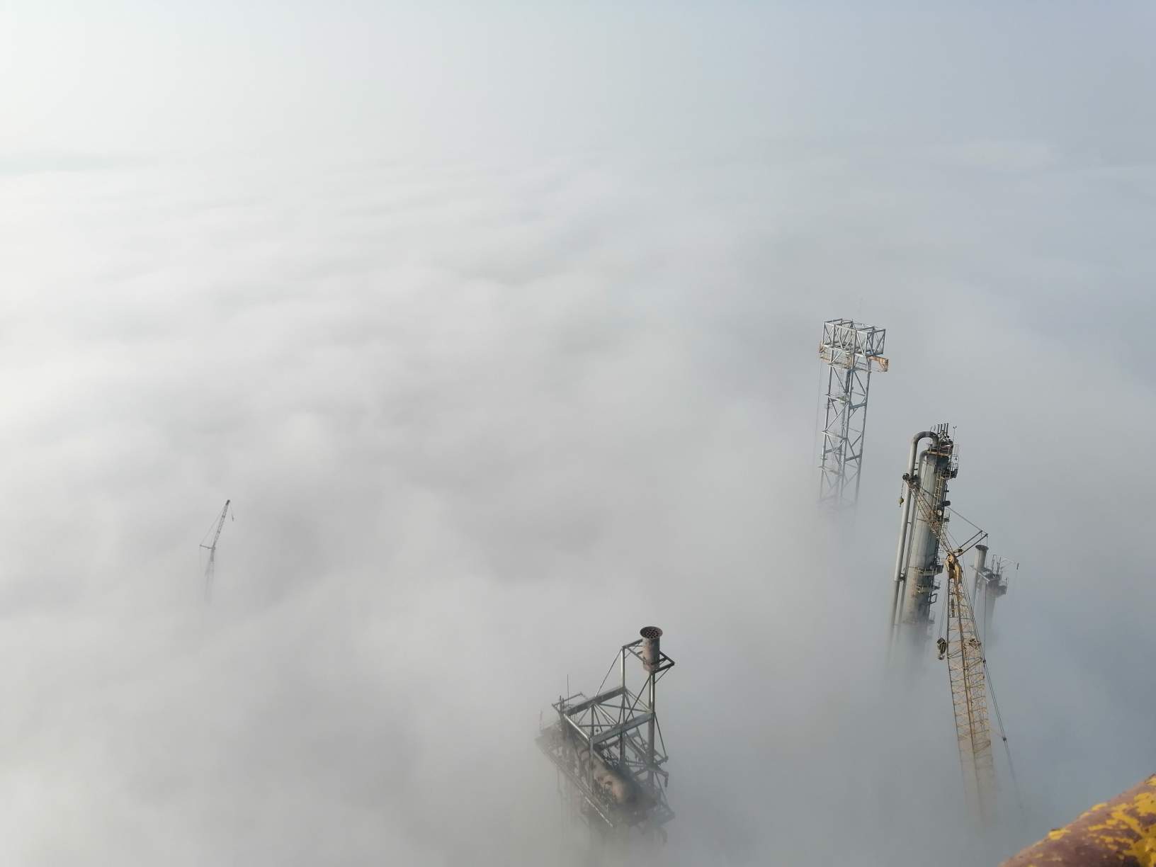 I am standing on a Urea Prilling Tower at approx height of 350 ft. Its foggy day but sun is shining at the top. Nothing is visible down there except some high rise vessels and a crane. It was good scenery.