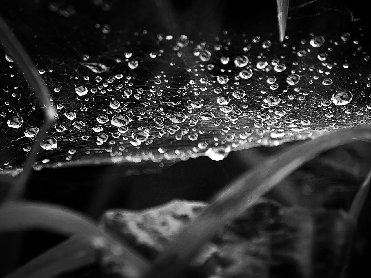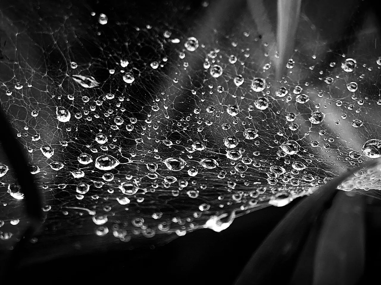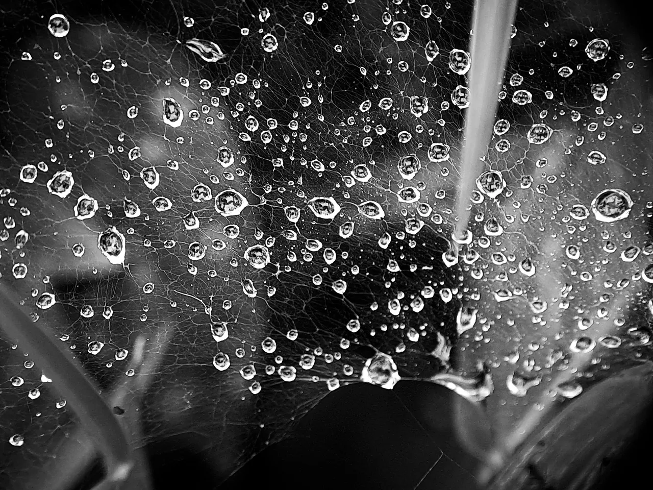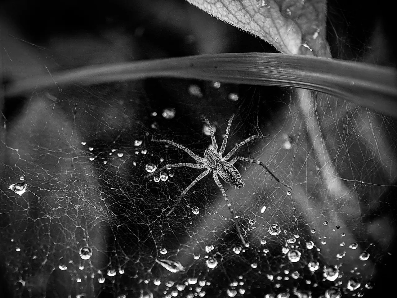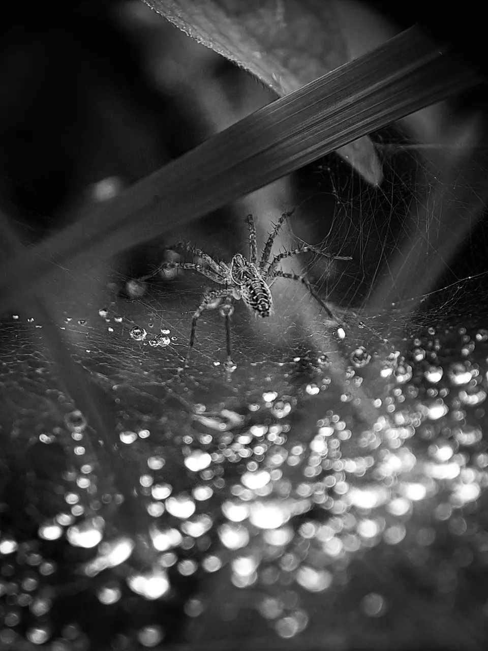 I accidentally noticed dew on a spider web, and I also noticed a spider beneath the dew wetting the web.