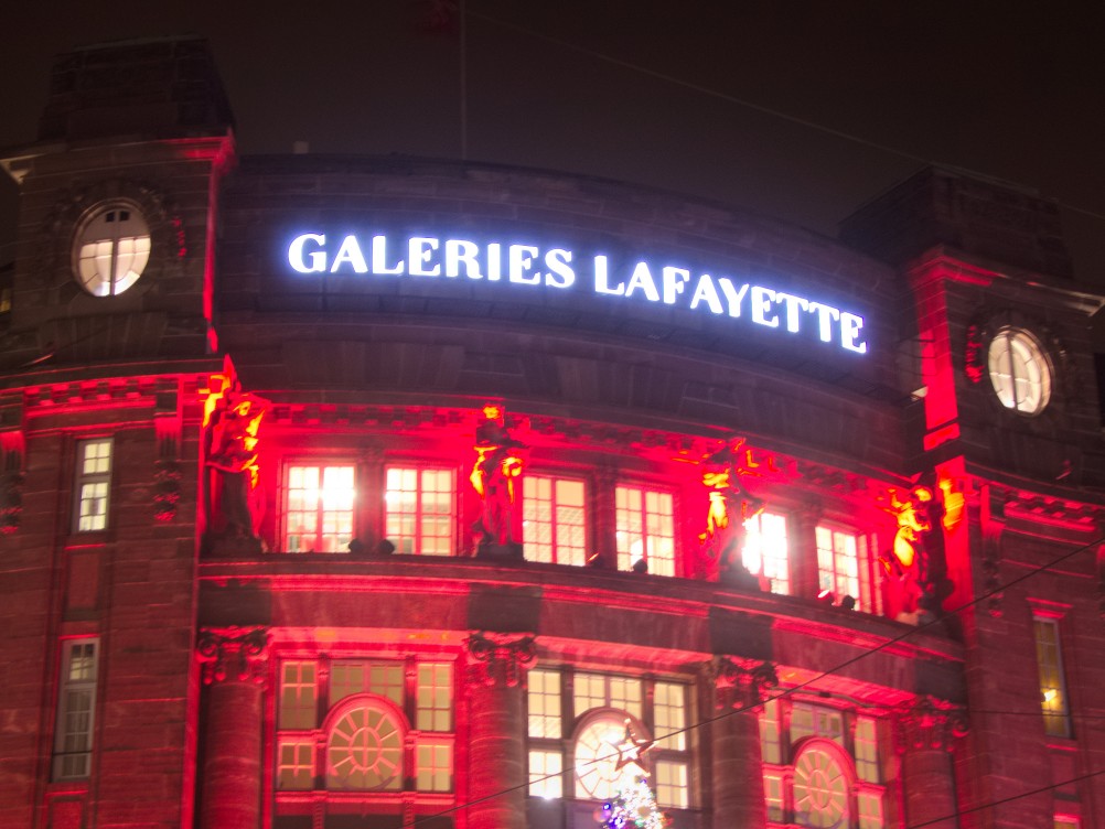 On continue avec la place Kléber, avec la statue du général et l'Aubette illuminée en rouge.