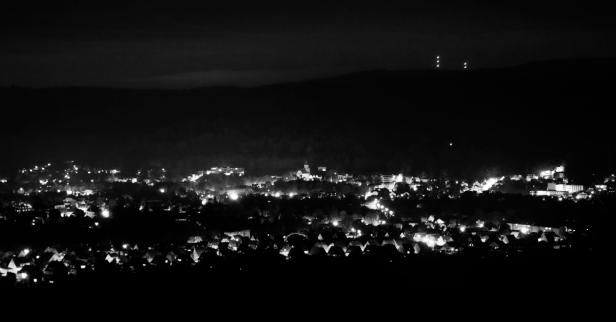 This is a nightscape of a small town in central Germany in the middle of the night. We were trying to find a good lookout spot to see a comet fly by. This picture was taken from a lookout tower on a hill outside the town.