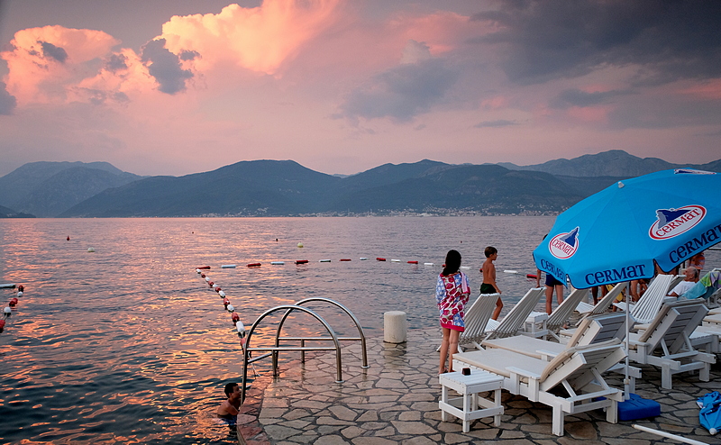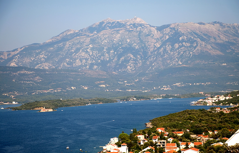 And now, let’s throw the first look from our terrace to the Bay of Boka Kotorska from the direction we just arrived. Here we can see the Bay of Tivat and Lovćen mountain with the Njegoš Mausoleum on the left peak…