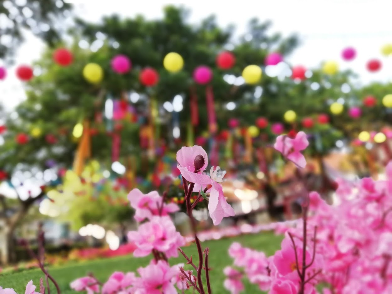 Here's a bokeh shot focusing on the decorations around the paths there. They are artificial flowers, but honestly speaking it is very hard to get flowers like these surviving for weeks in Malaysia without very intense care so it's totally justified :)