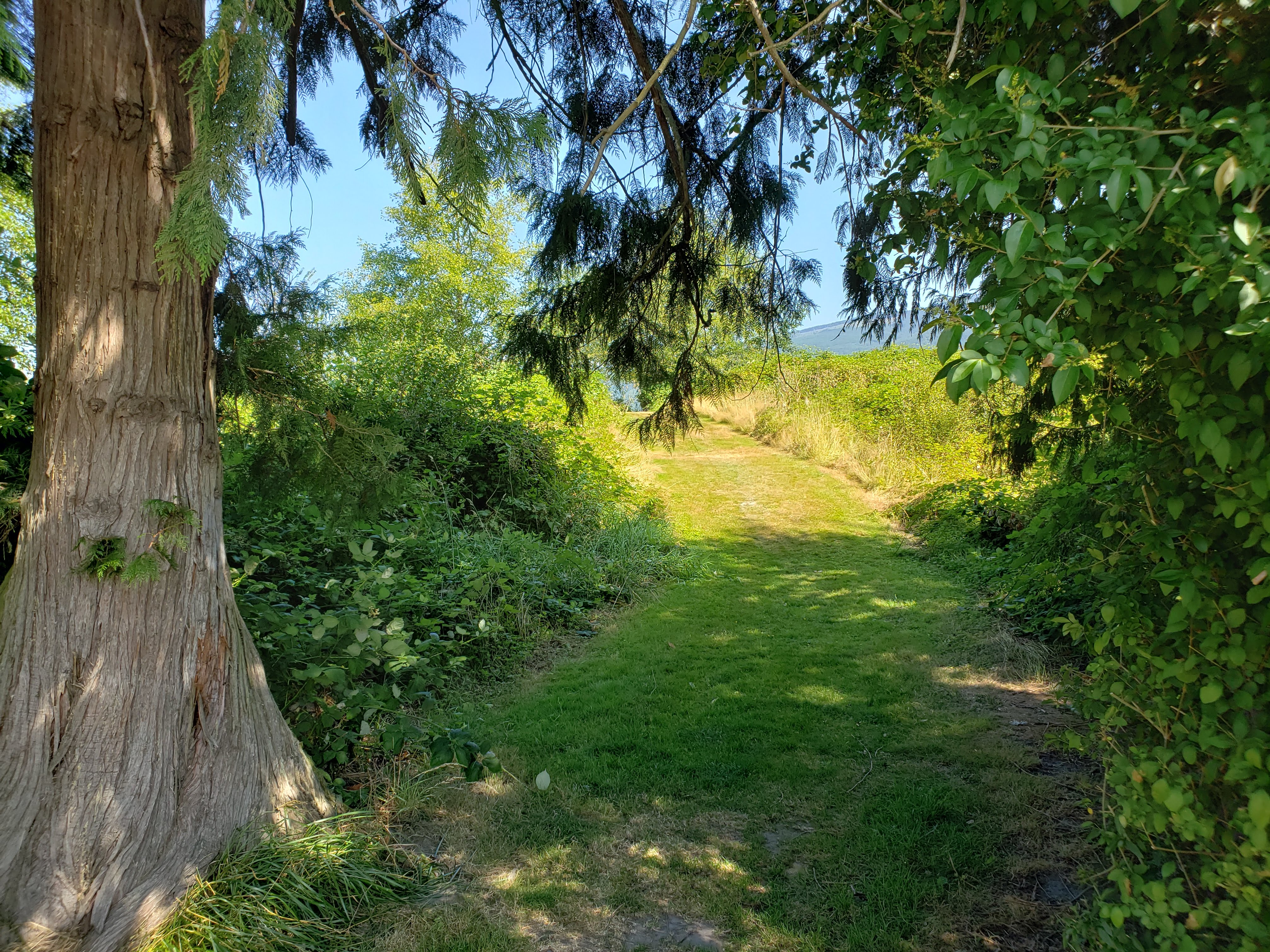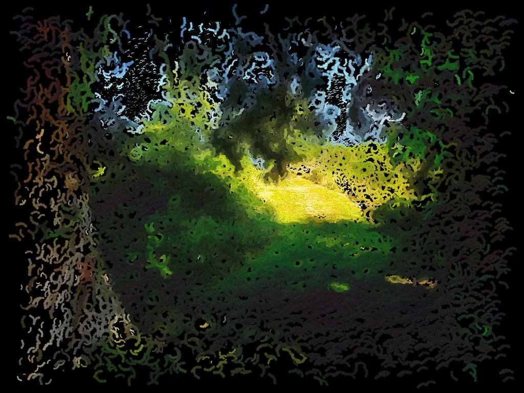 I was playing around in GIMP this morning and having fun modifying one of my recent photos. I took this photo when I was out walking around a disc golf course. There was an inviting path going between a line of trees and some bramble bushes. Someone has been maintaining it well and mowing back the bushes.